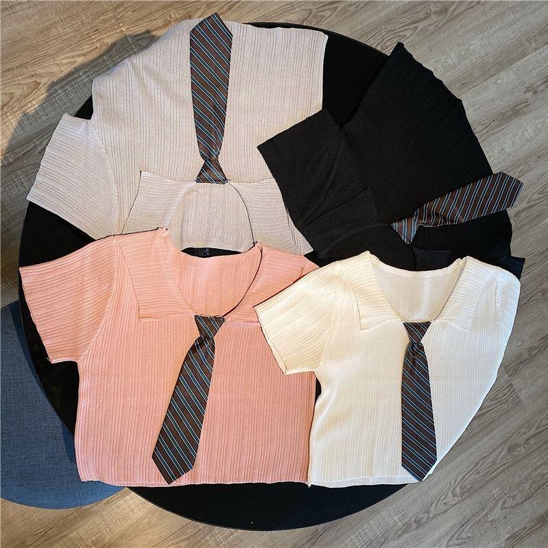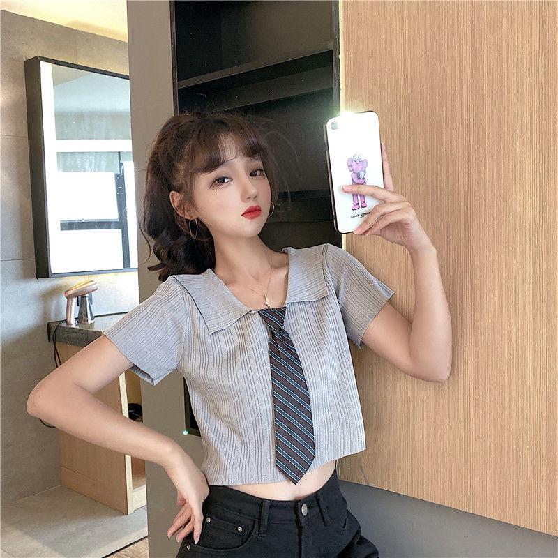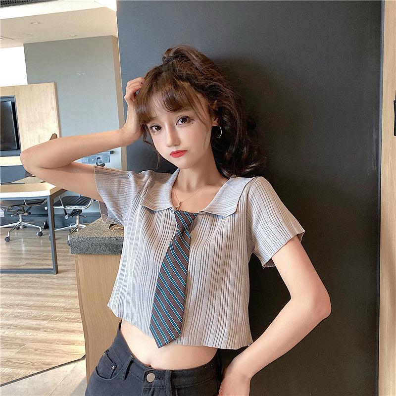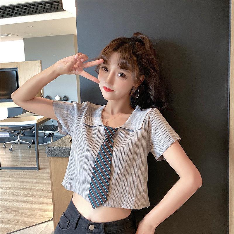 Летний облегающий топ с коротким рукавом и трикотажем в корейском стиле с воротником поло для женщин