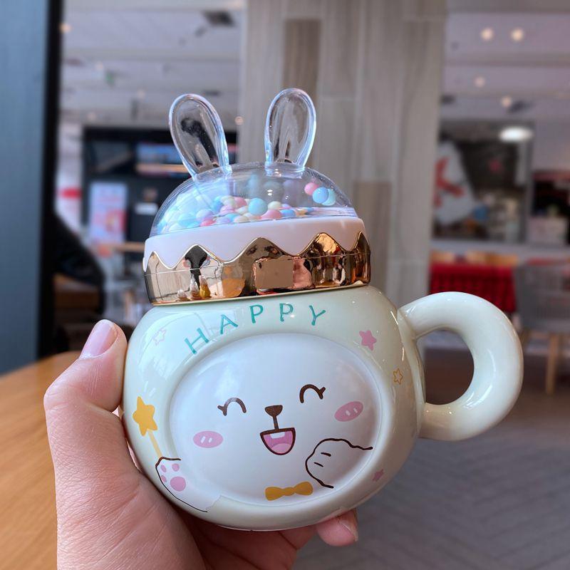 Кружка с кроликом, с крышкой и ложкой, чашка для мужчин и женщин, керамическая чашка для питья воды, парная, мультяшная, высокая ценность, большая вместимость, кофейная кружка