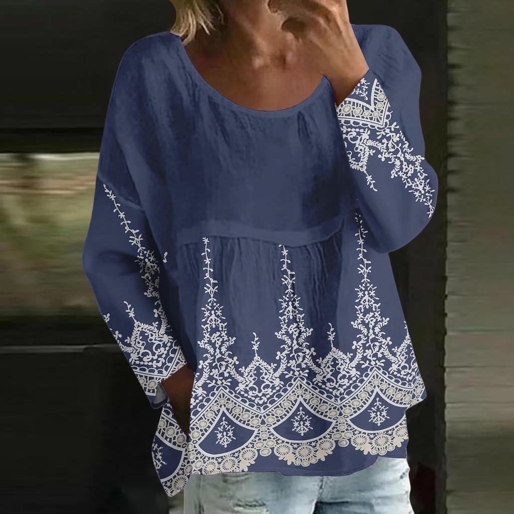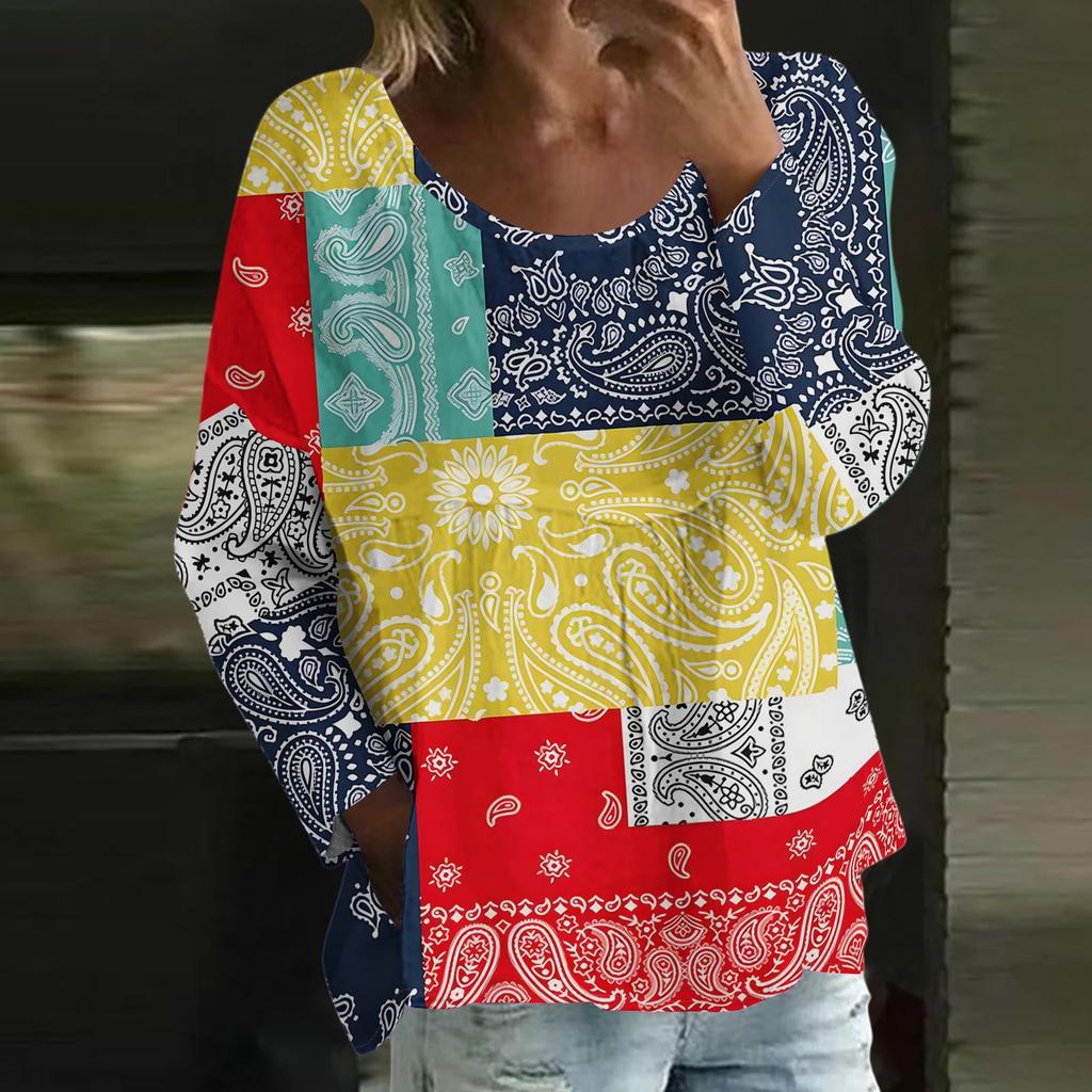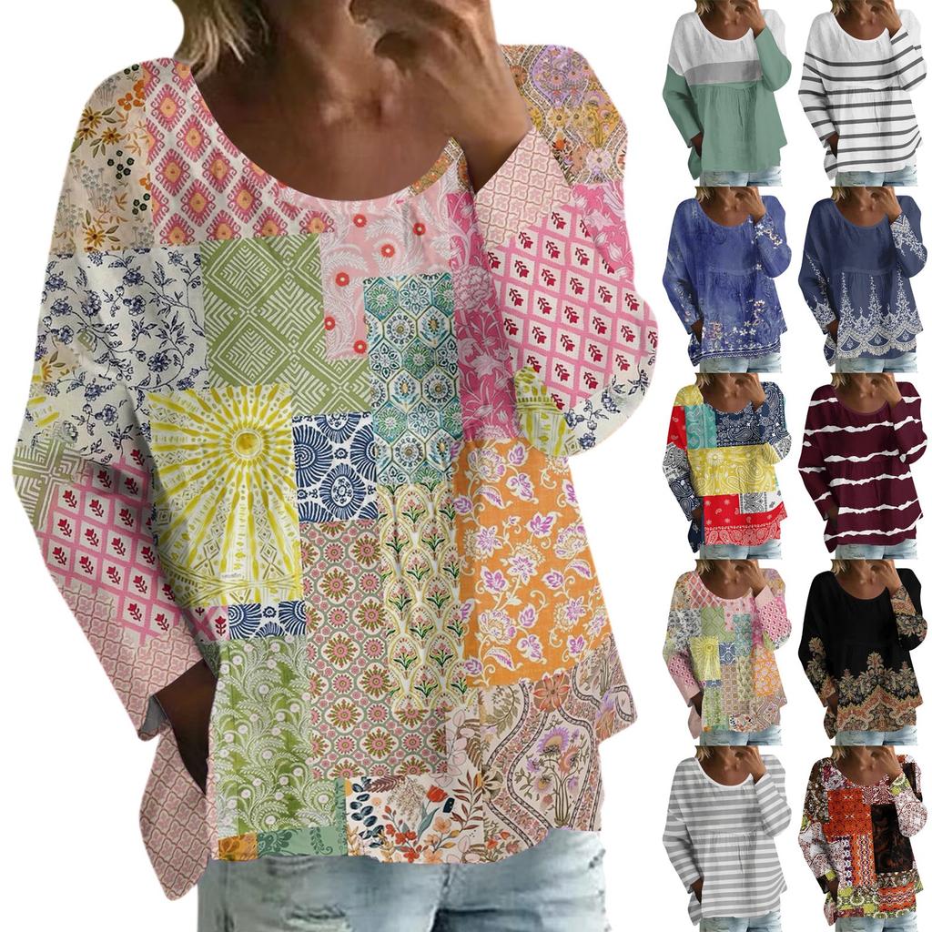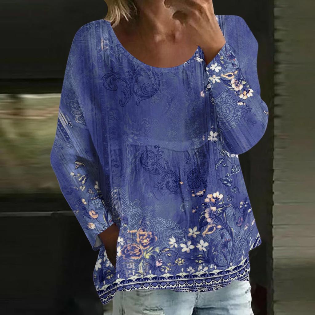 Женский повседневный модный свободный топ с круглым вырезом и цветочным принтом, с длинным рукавом