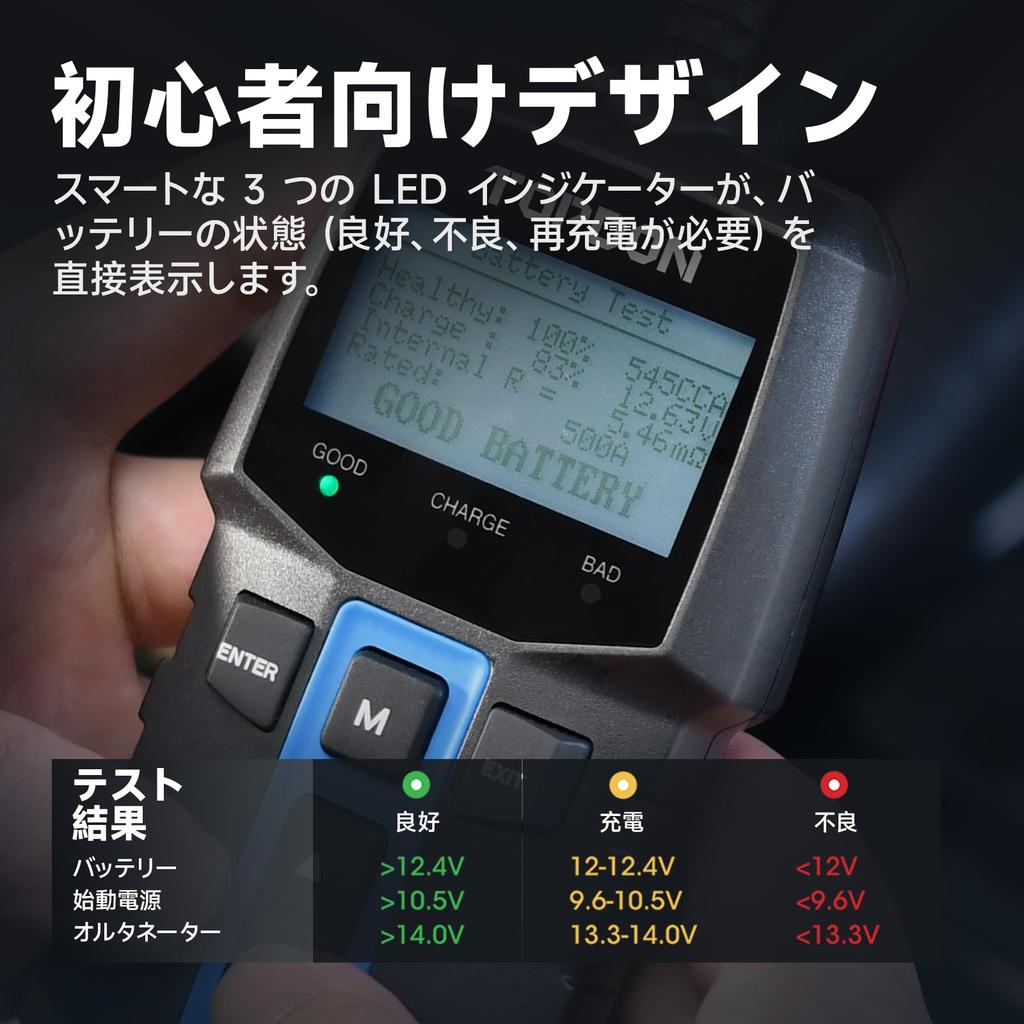 [3 светодиодных индикатора] Просто в использовании, даже для начинающих. Диагностический тестер оснащен светодиодными индикаторами, которые показывают результаты теста с первого взгляда.. Зеленый цвет указывает на хорошее состояние, желтый цвет указывает на необходимость зарядки, а красный цвет указывает на плохое состояние и необходимость замены.. уведомление: Пожалуйста, убедитесь, что зажимы надежно соединены перед тестированием.