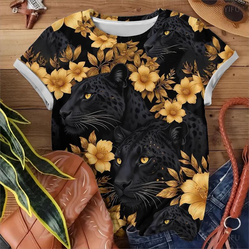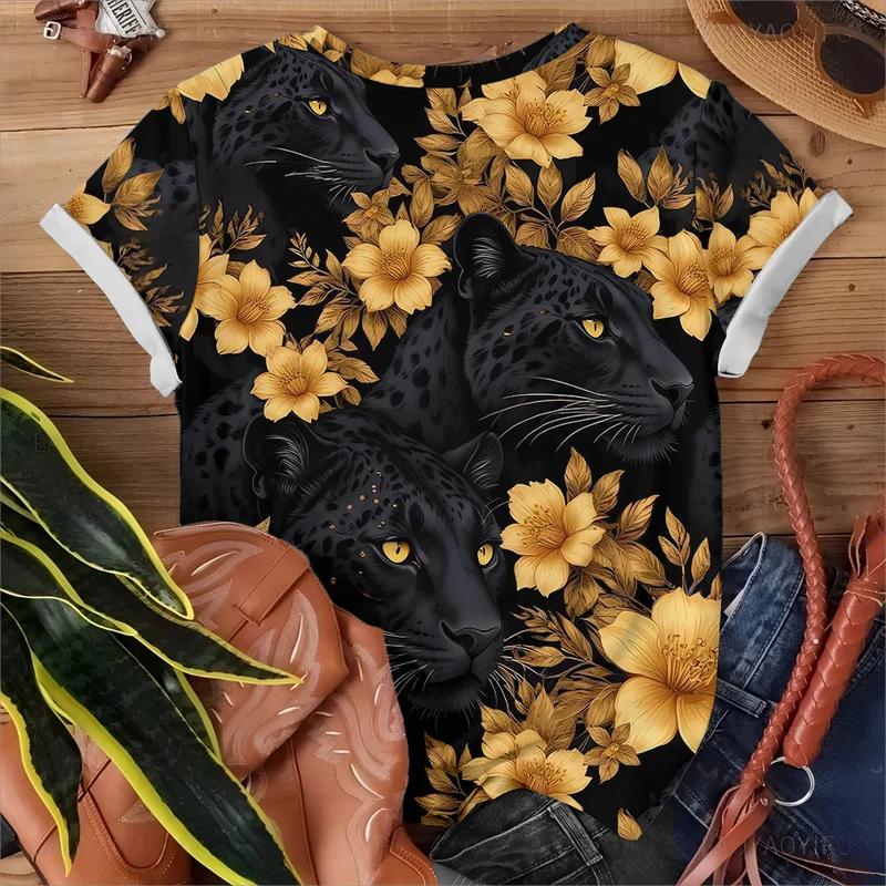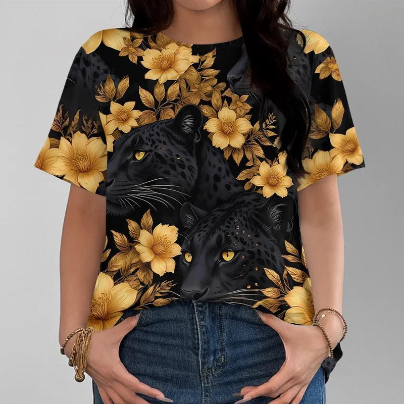 Смелый леопардовый принт золотой цветок женская футболка повседневная модная свободная удобная черная с коротким рукавом