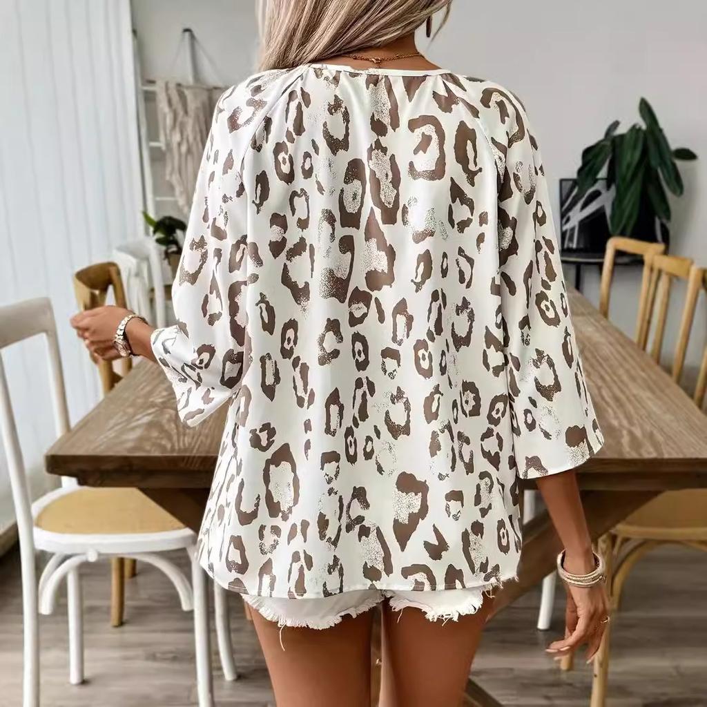 Темпераментный Топ для Поездок Леопардовый Принт Большой V-образный вырез Плиссированный Рукав Семь Четвертей Женские Блузки и Рубашки