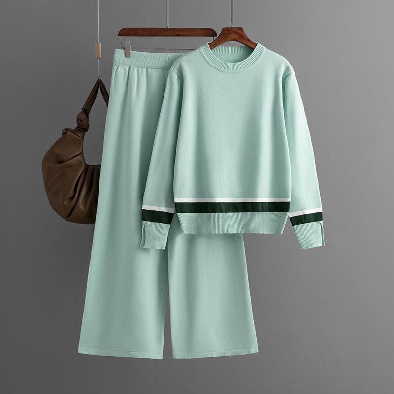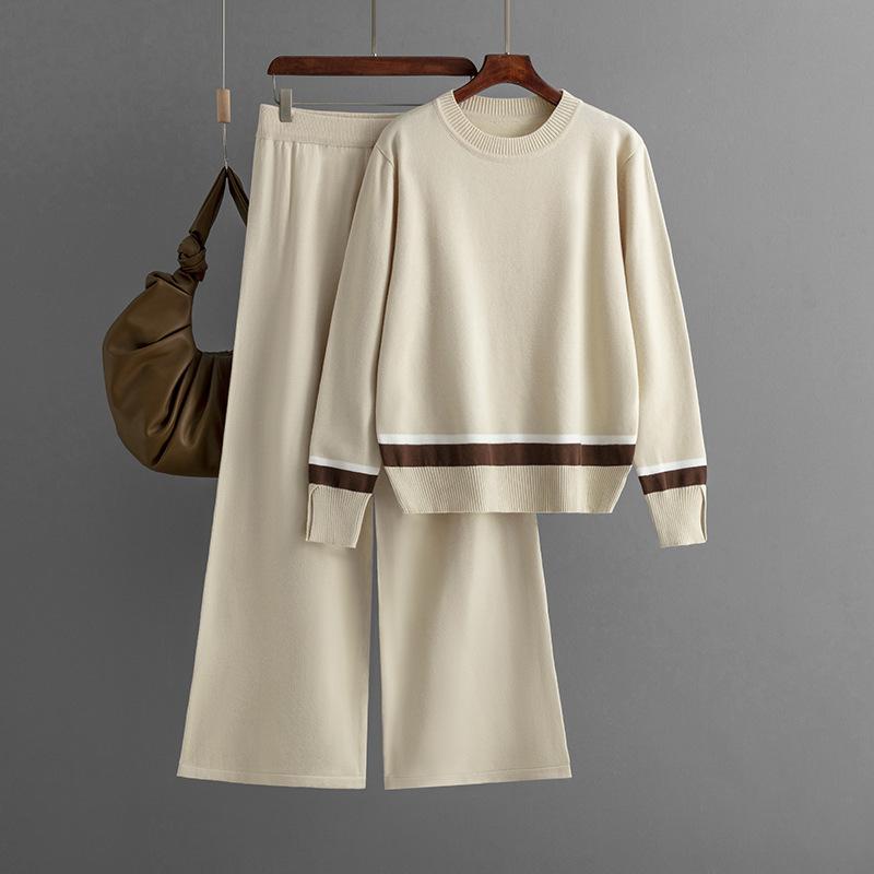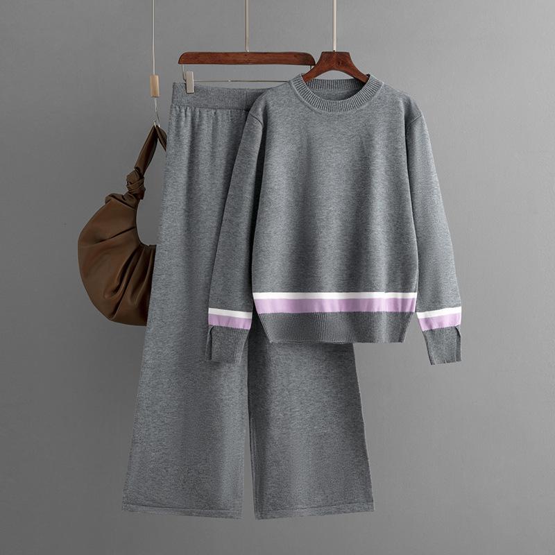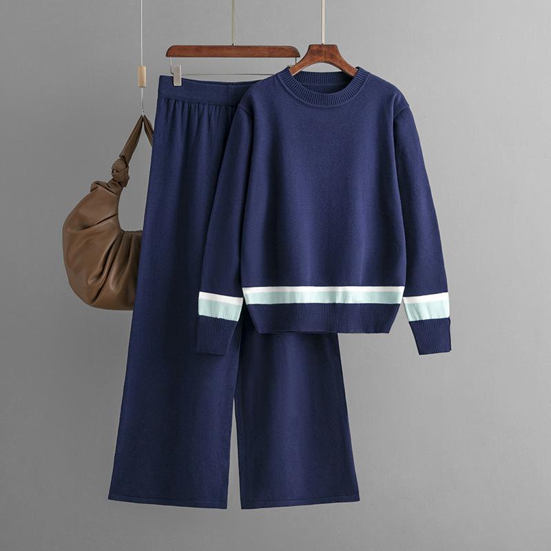 Новый осенне-зимний контрастный вязаный костюм-двойка с широкими брюками и свободным тонким полосатым вязаным верхом для женщин