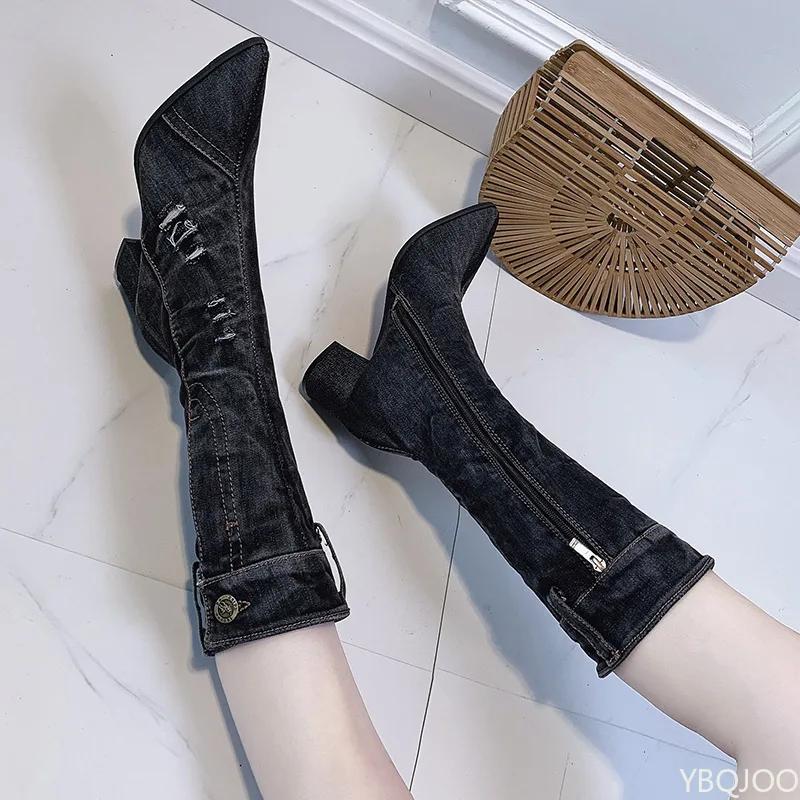 Женские массивные джинсовые полусапоги 2025 года, ботинки на высоком блочном каблуке, зимняя мода, ковбойские сапоги в западном стиле, обувь на толстом каблуке