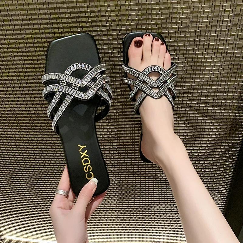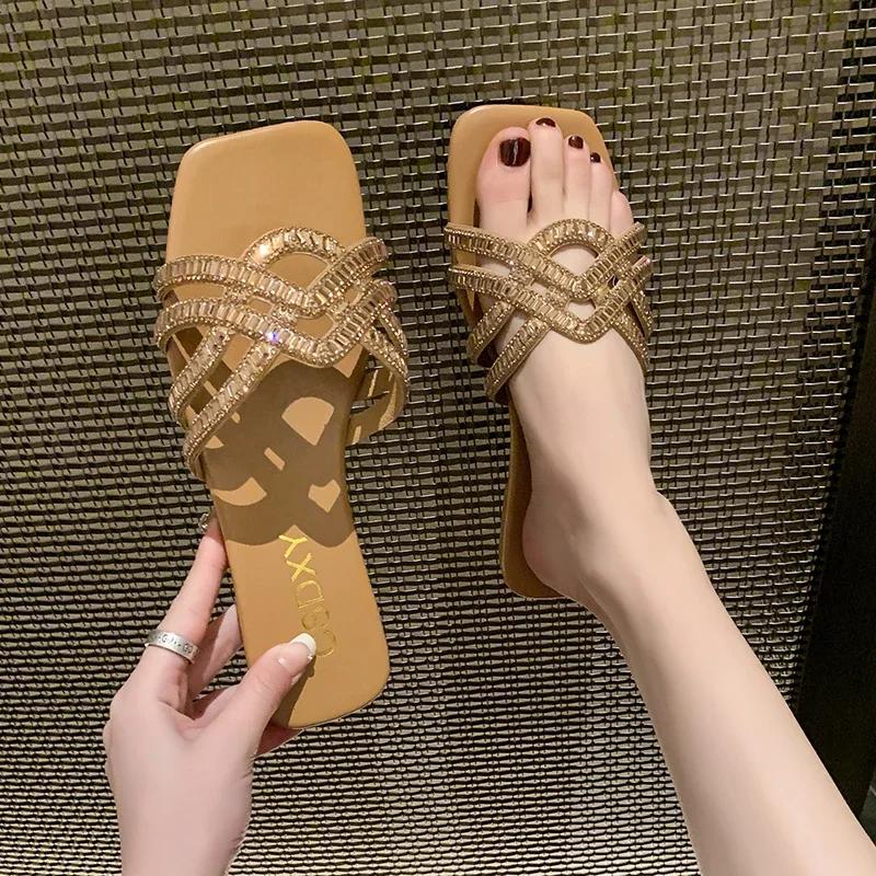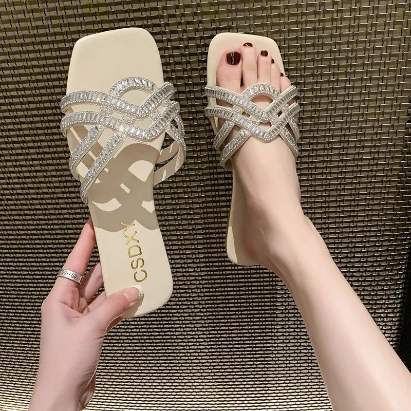Женские тапочки, роскошный дизайн, женские летние шлепанцы со стразами на плоской подошве, уличные модные женские тапочки, повседневные вечерние пляжные шлепанцы