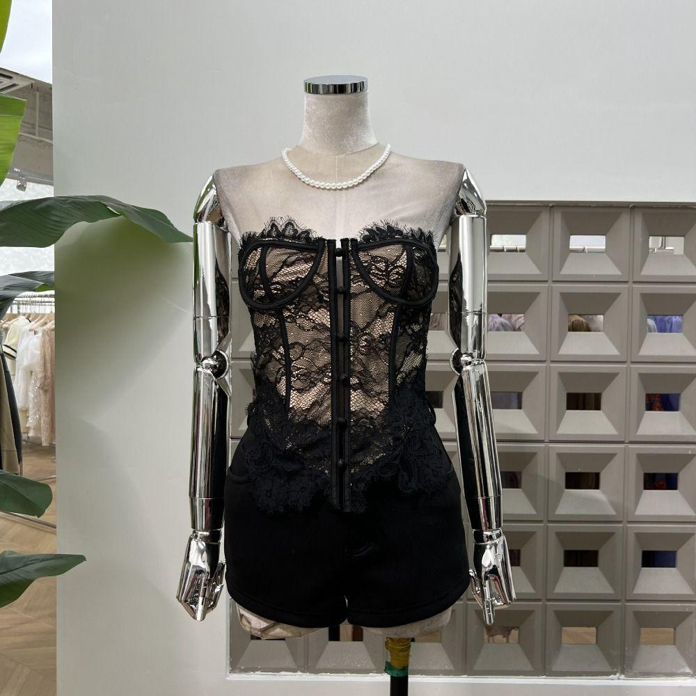 Кружевной корсет, сетчатый топ без рукавов, элегантная кружевная майка на пуговицах для леди