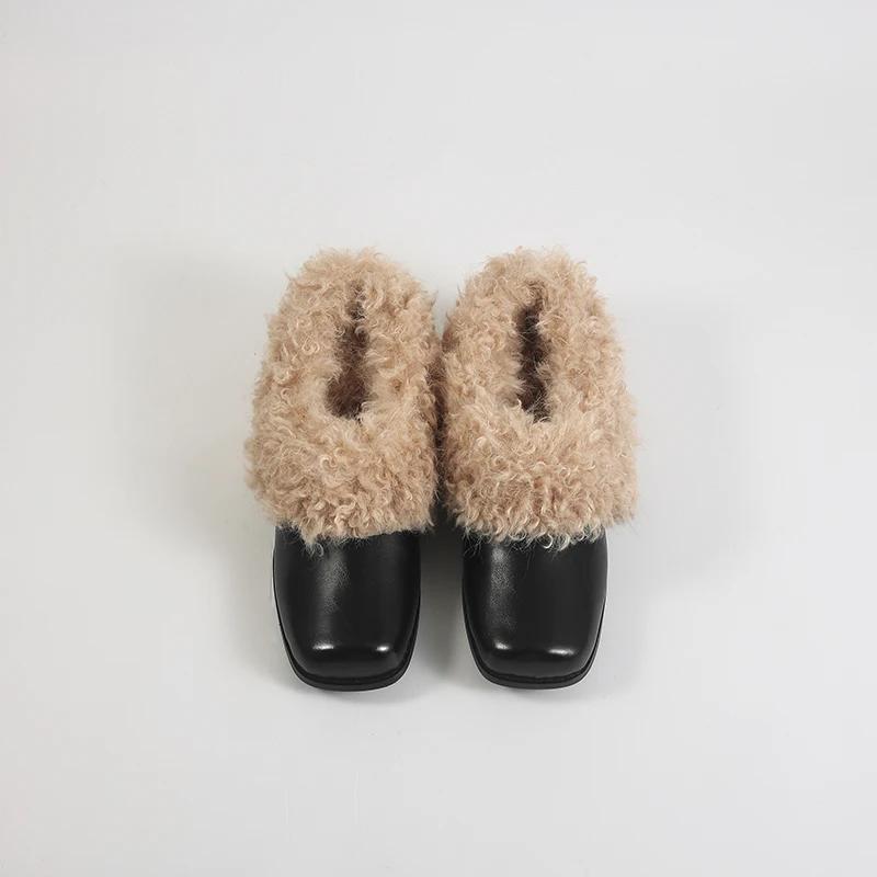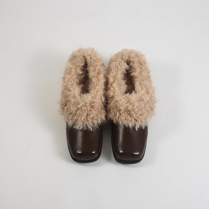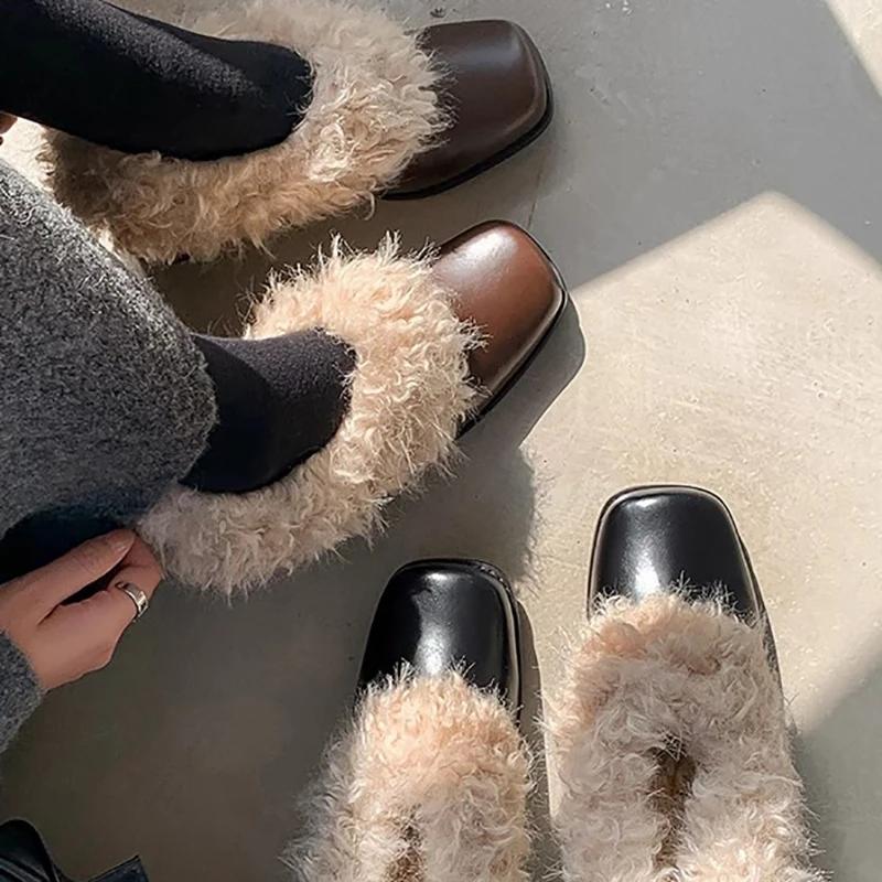 Дизайнерские пушистые туфли Мэри Джейн Модные неглубокие слипоны Зимние теплые туфли с квадратным носком и толстым каблуком