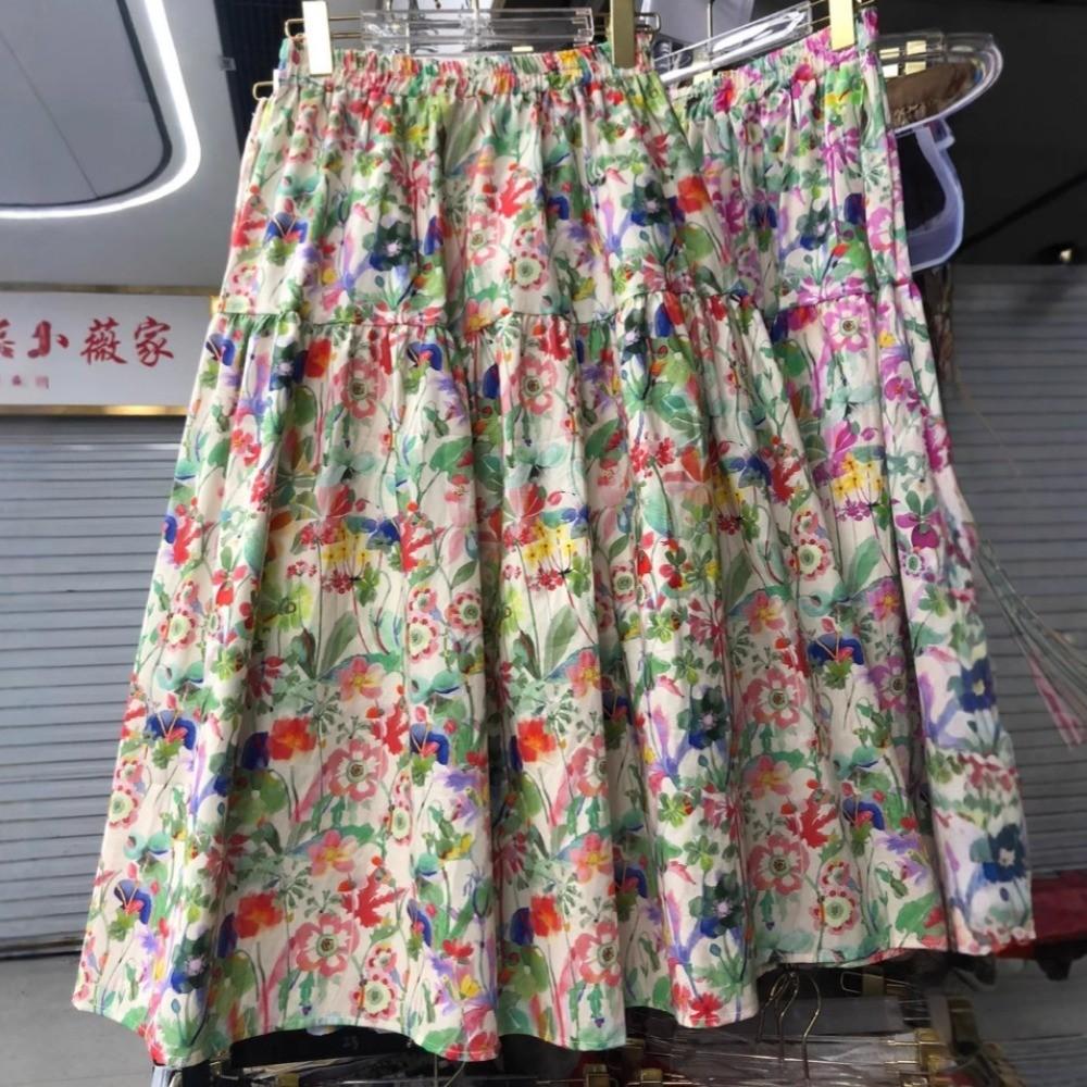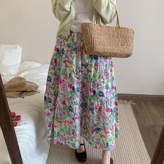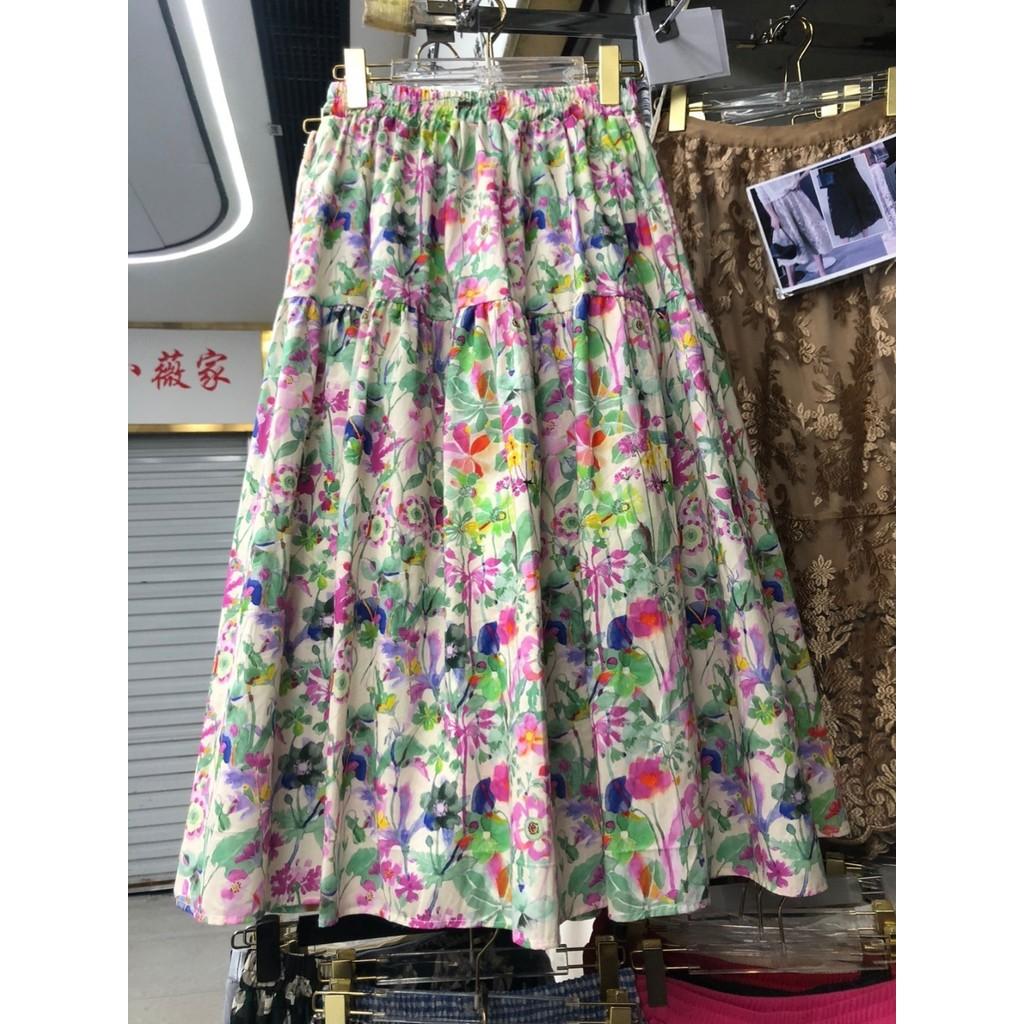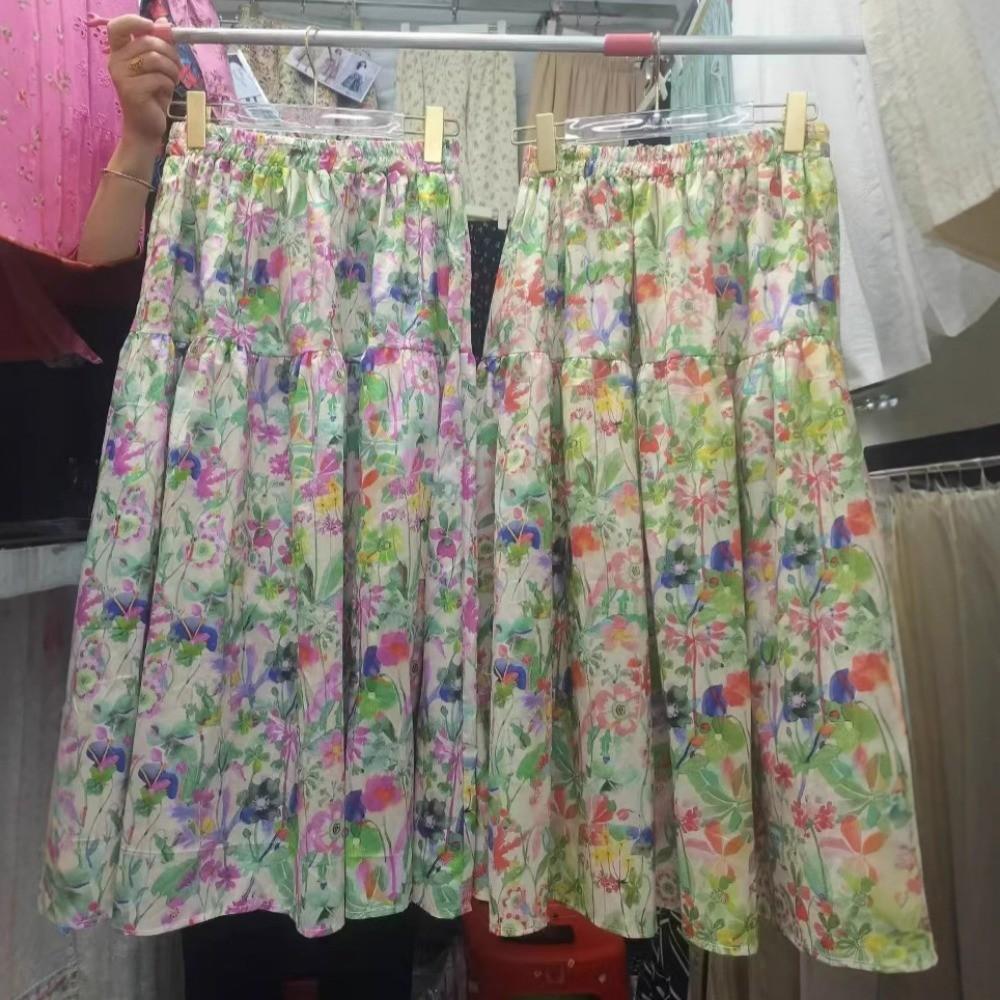 Qooth Ретро Женская Юбка А-силуэта с Цветочным Принтом Широкий Подол Миди Длина Эластичная Талия Повседневная Юбка QT2637