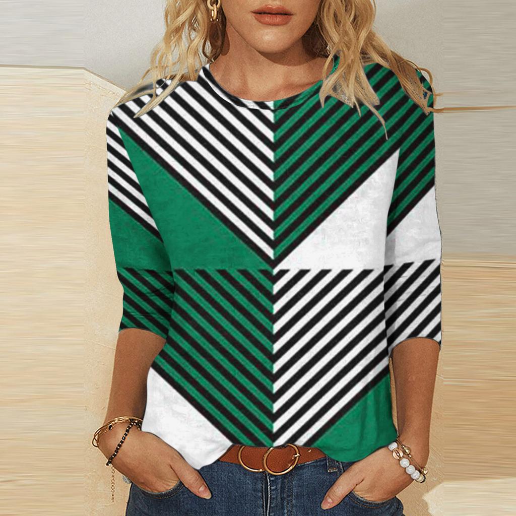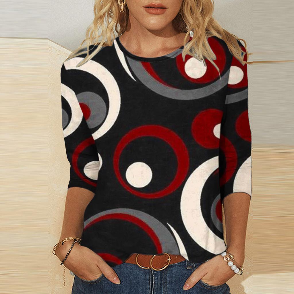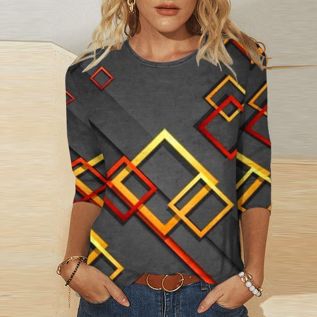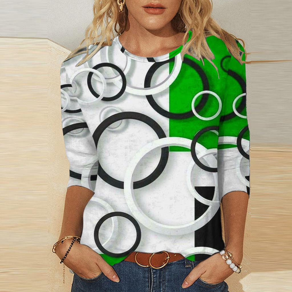 Художественный геометрический узор, принт, модный контрастный цвет, персонализированный круглый вырез, женские футболки с длинным рукавом