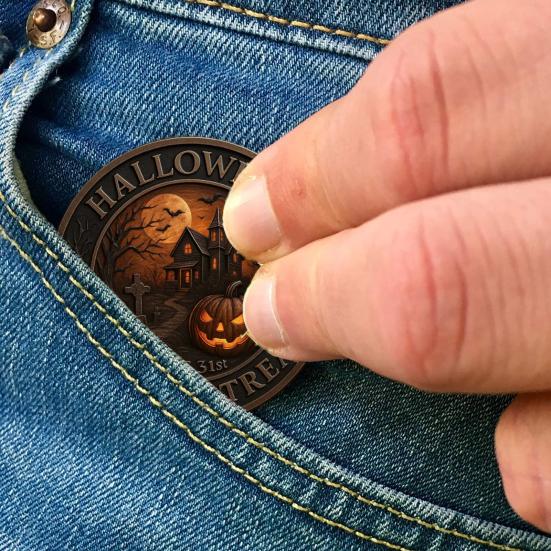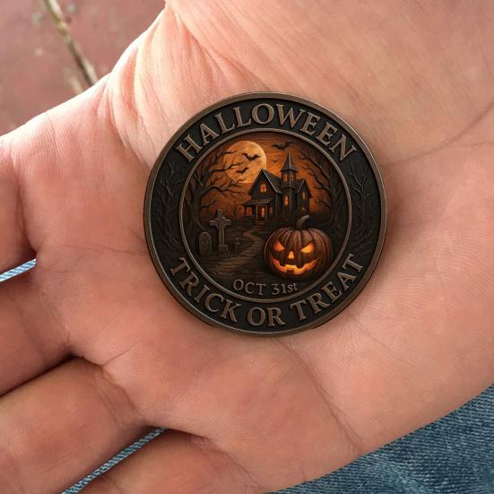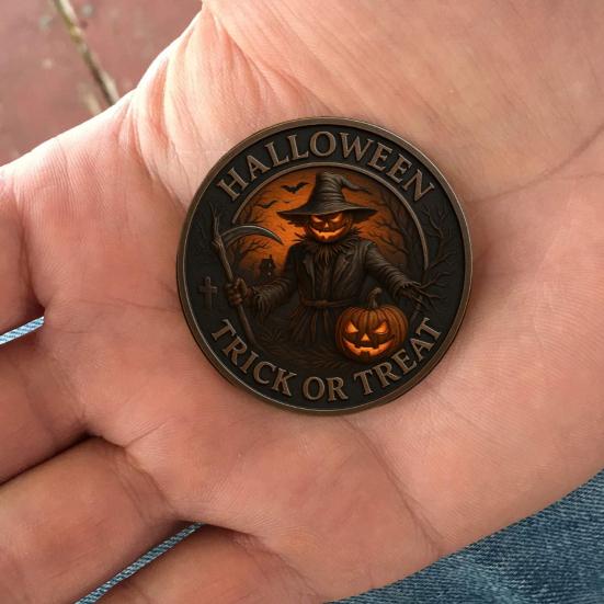 Металл премиальной отделки: Эта монета на Хэллоуин, изготовленная из металла высшего качества с отделкой под старую бронзу, обладает жутко красивой эстетикой.. Блестящие медные акценты подчеркивают его жуткое очарование, делая его выдающимся экспонатом в любой коллекции или декоре на тему Хэллоуина.