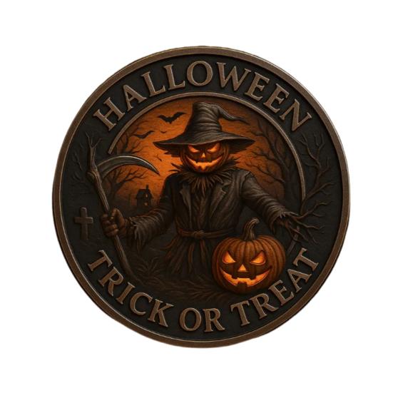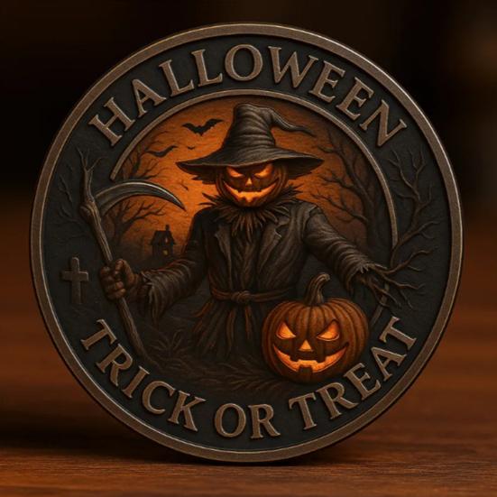 Примите Странное Обаяние: Погрузитесь в дух Хэллоуина с нашими монетами издания «Жнец-пугало с тыквой».. Эти уникальные изделия сочетают в себе элементы «сладости или гадости» с ноткой жутковатости, добавляя восхитительный, но жуткий шарм вашим праздничным украшениям и вечеринкам.