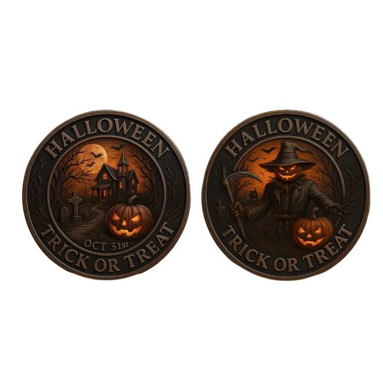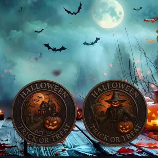 Отпразднуйте жуткий сезон с нашей монетой на Хэллоуин, украшенной леденящими душу изображениями пугал-жнецов, летучих мышей, надгробий и домов с привидениями.. Эта памятная монета, изготовленная из металла с премиальной отделкой в жутком старинном бронзовом тоне, является обязательным экспонатом для любой коллекции Хэллоуина.. Блестящие медные акценты добавляют ему очарования, делая его выдающимся элементом вашего праздничного декора..