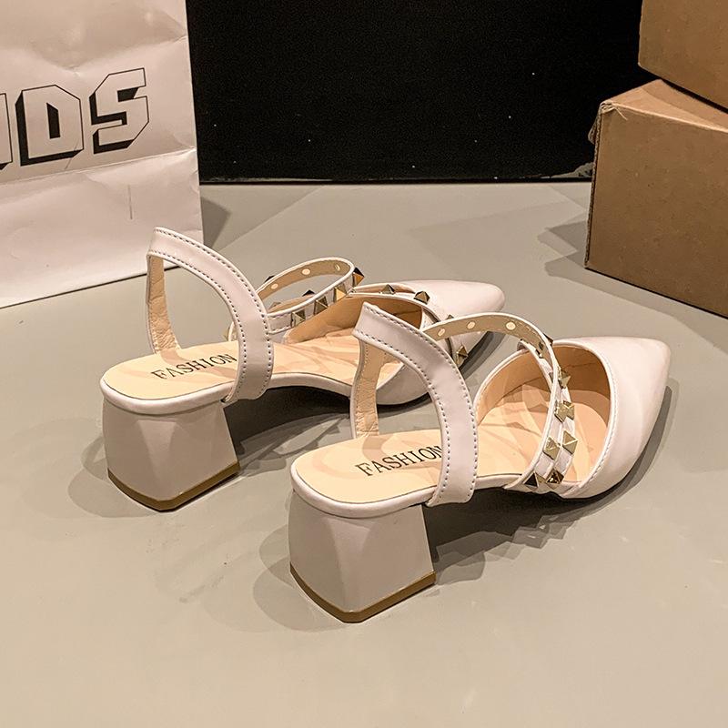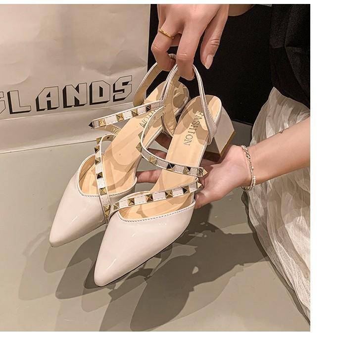 Босоножки с заклепками, женские, на толстом каблуке, весенне-летние новинки, модные лакированные, с острым носком, бежевые, на танкетке, крутые