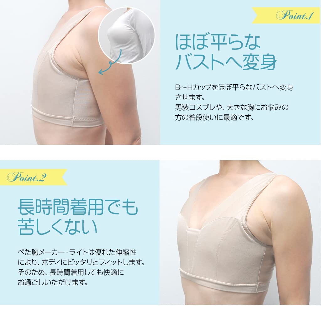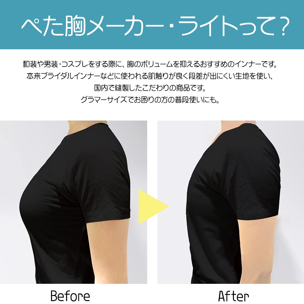 Уплощает пышную грудь / Бюстгальтер для кимоно, кроссдрессинга, косплея в мальчишеском стиле и тех, кто хочет казаться стройнее / Подходит для повседневной носки тем, кто страдает от пышной груди / Позволяет носить разнообразную одежду, даже если у вас большая грудь / Не нужно беспокоиться о подпрыгивающей груди во время упражнений, таких как бег / Эластичная ткань для комфортной носки даже в течение длительного времени / Дышащий сетчатый материал / Утягивает и контурирует подмышечные и спинные складки / Сделано в Японии для уверенности / Поддерживает трансгендерных людей / <<Различия между "Flat Chest Maker" и "Flat Chest Maker Lite">> "Flat Chest Maker" и "Flat Chest Maker Lite" используют разные ткани. «Создатель плоской груди» использует атлас по подолу. "Flat Chest Maker Lite" использует пауэрнет для сетчатой текстуры. Сетчатая текстура обеспечивает хорошую воздухопроницаемость и изготовлена с использованием того же запатентованного производственного процесса, но она разработана для еще большего сглаживания бюста.. Это тщательно изготовленное изделие, выполненное из удобной, непросвечивающей ткани, изначально использовавшейся для свадебного нижнего белья.