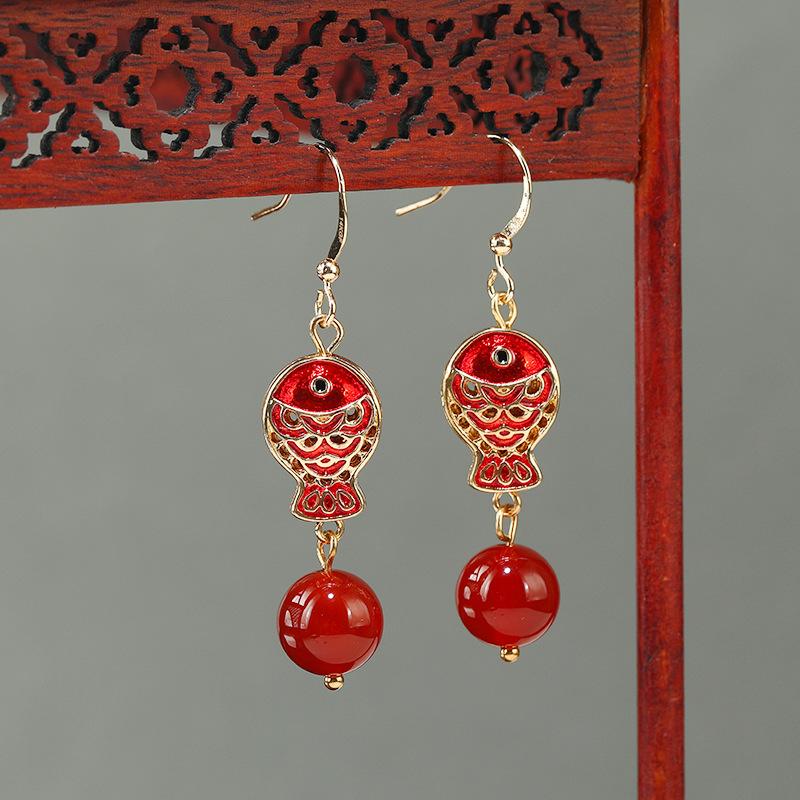 Винтажные серьги в китайском стиле с красными карпами кои, нишевый дизайн, женственность, этнический стиль, нефритовые серьги, серьги, тренд