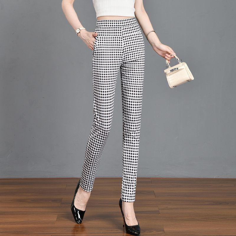 Корейская мода Женская одежда Брюки-карандаш Весна Лето Повседневные Черные Белые Клетчатые Новые Эластичные С высокой талией Стройнящие Прямые Брюки