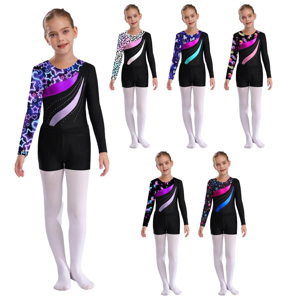 Комплект купальника со стразами для девочек, с длинным рукавом, с принтом, в стиле пэчворк, с шортами с V-образным вырезом спереди, соревновательный наряд — купить товар онлайн с бесплатной доставкой по всему миру!
