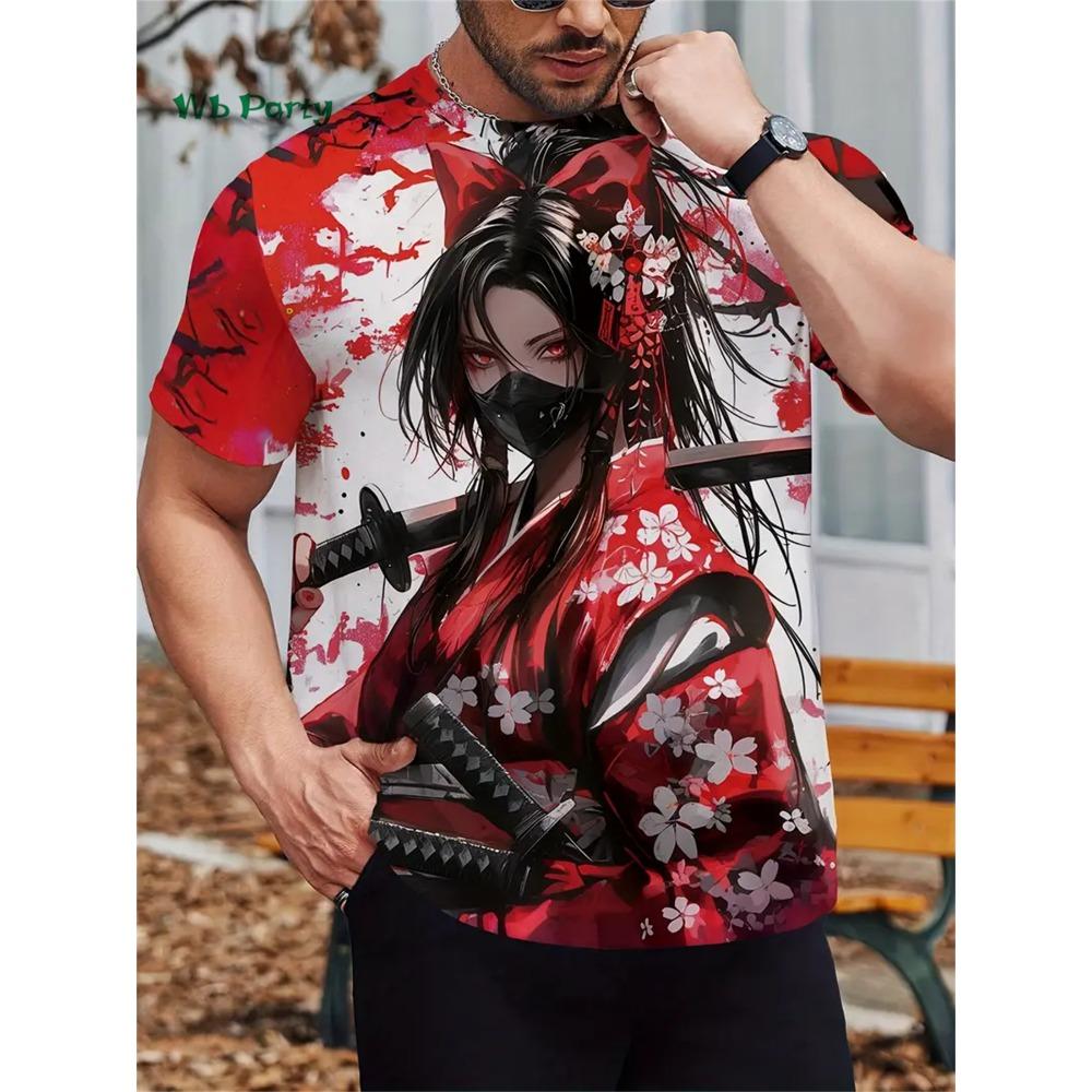 Мужская футболка с узором «Сакура Самурай», футболка с коротким рукавом в стиле японского аниме, топы Харадзюку, летняя мужская одежда оверсайз в стиле кэжуал