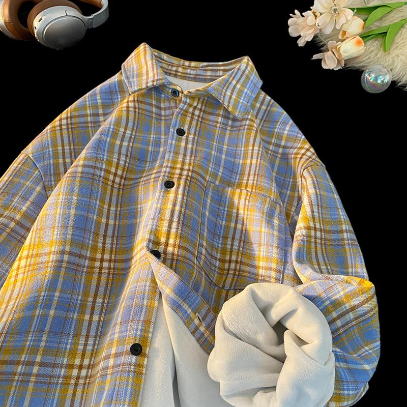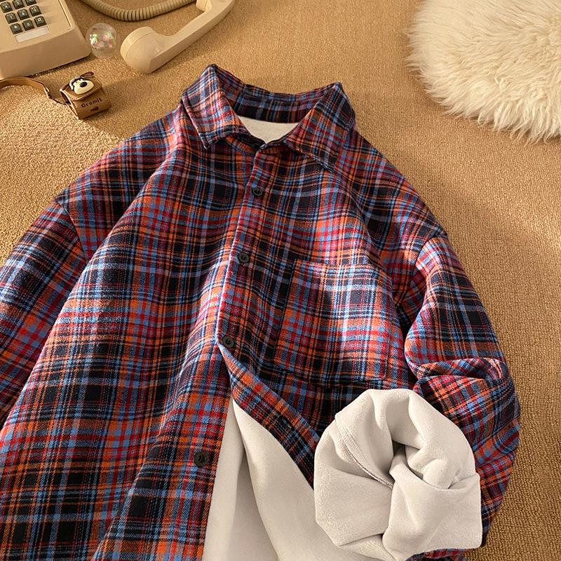 Свободная осенне-зимняя американская ретро-клетчатая рубашка-куртка большого размера с лацканами и длинными рукавами на флисе, мужская и женская.