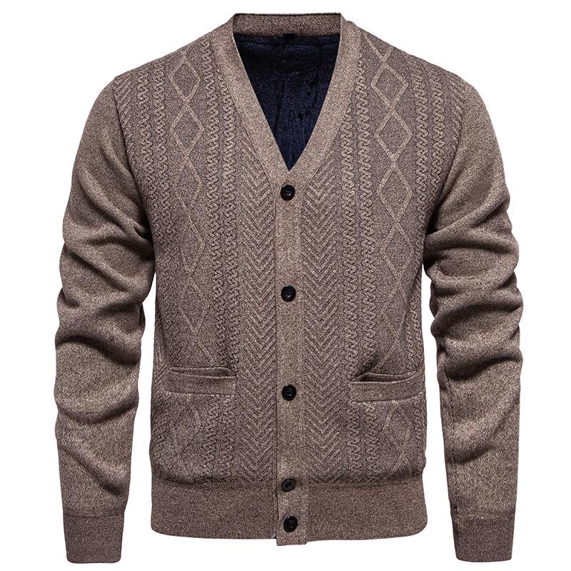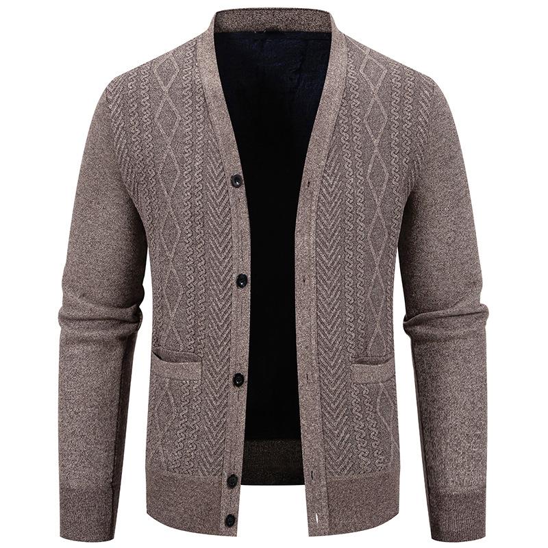 Мужской жаккардовый кардиган на пуговицах, вязаный свитер-куртка, теплый свитер с плюшевой подкладкой для мужчин