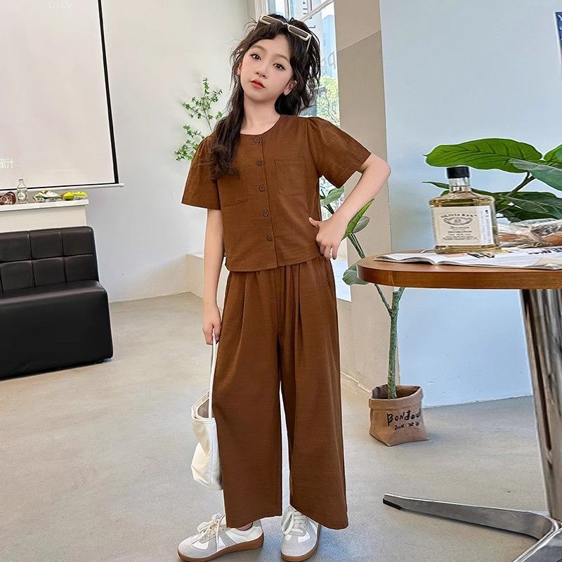Летний комплект для девочек: топ с коротким рукавом, брюки с широкими штанинами. Хлопково-льняной комплект из двух предметов. Тонкий летний наряд.