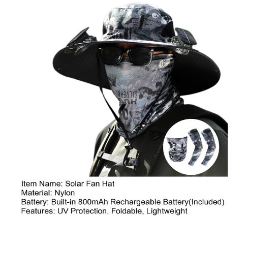 В дополнение к шляпе с солнечным вентилятором вы также получите пару нарукавников и солнцезащитную гетру на шею для комплексной защиты кожи от солнечных ожогов.. Оставайтесь без помощи рук и чувствуйте себя комфортно во время приключений на свежем воздухе с этим универсальным и практичным комплектом шляп-вентиляторов с солнечной батареей.