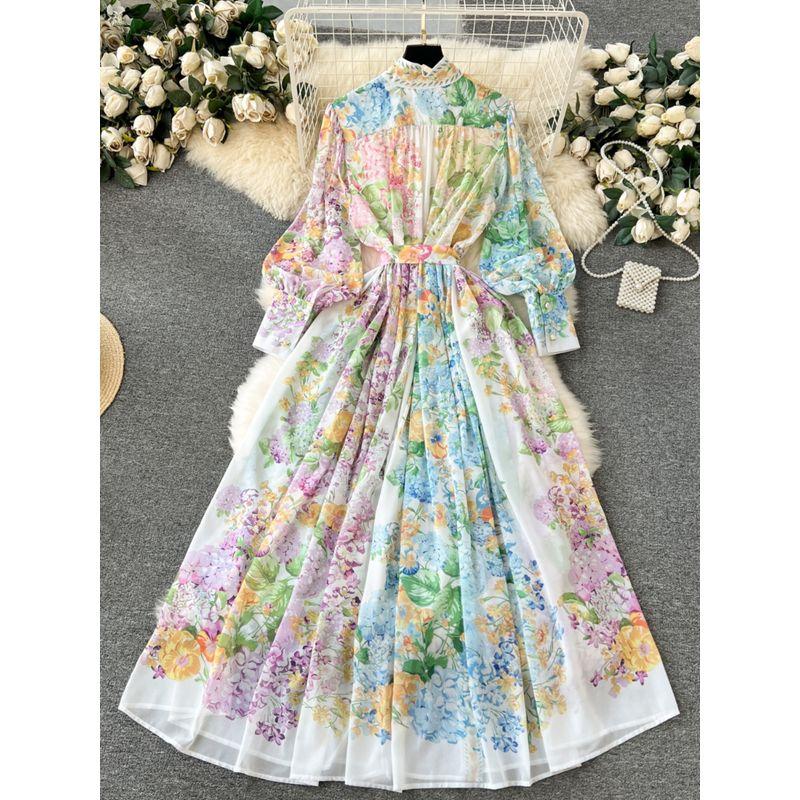 Flowers Elegant Stand-up Collar Slim Fit Long Dress Breasted