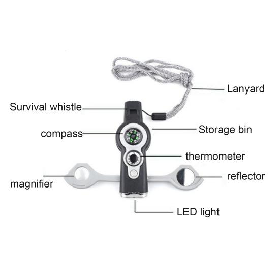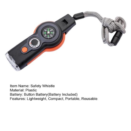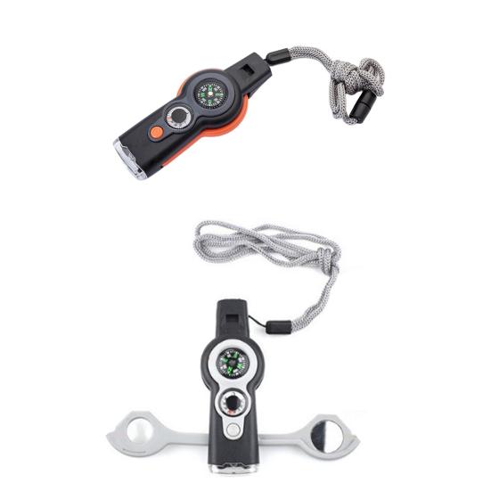 Наш свисток 7-в-1 имеет множество функций, таких как компас, термометр, отражающее сигнальное зеркало, увеличительное стекло, светодиодный фонарь и резервуар для хранения.