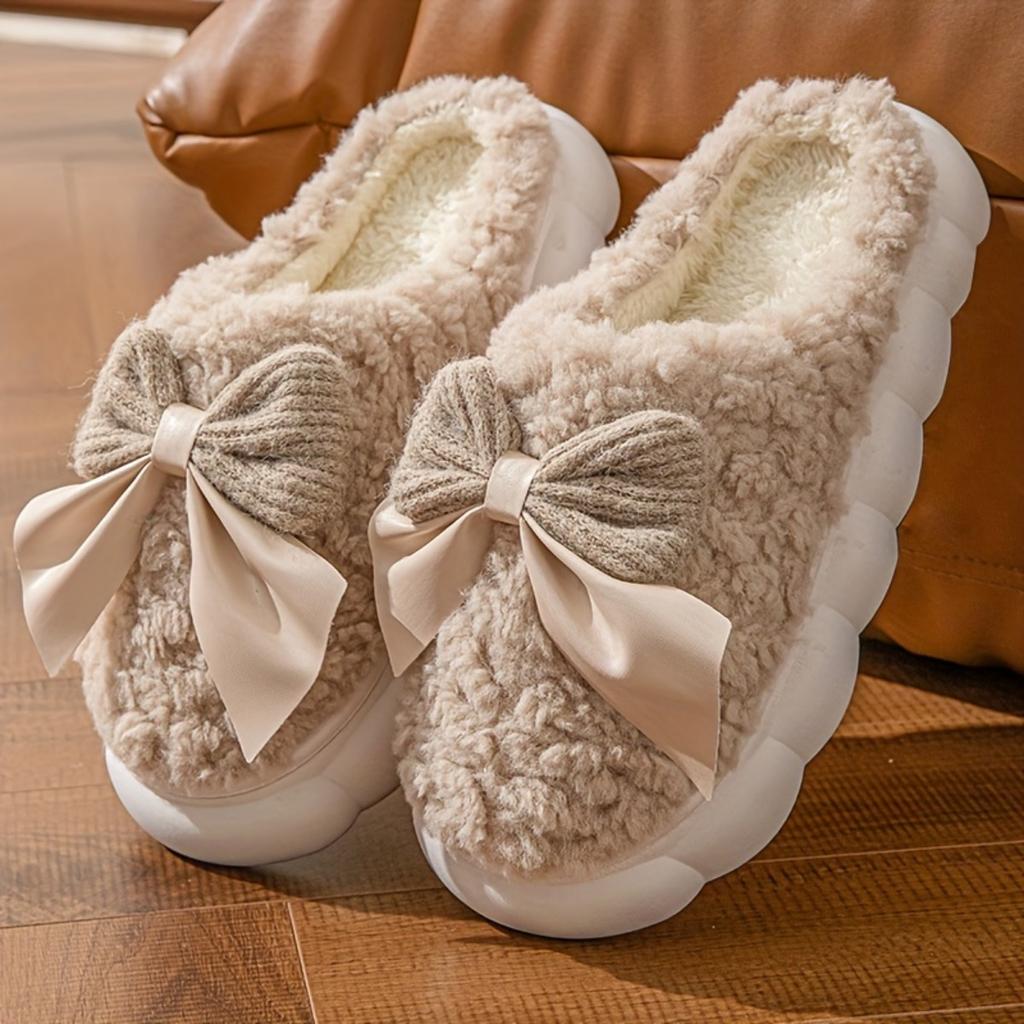 Женские зимние теплые плюшевые тапочки, повседневные однотонные с бантом, домашняя обувь для помещения, толстая подошва, противоскользящие, необходимые домашние тапочки для осени и зимы