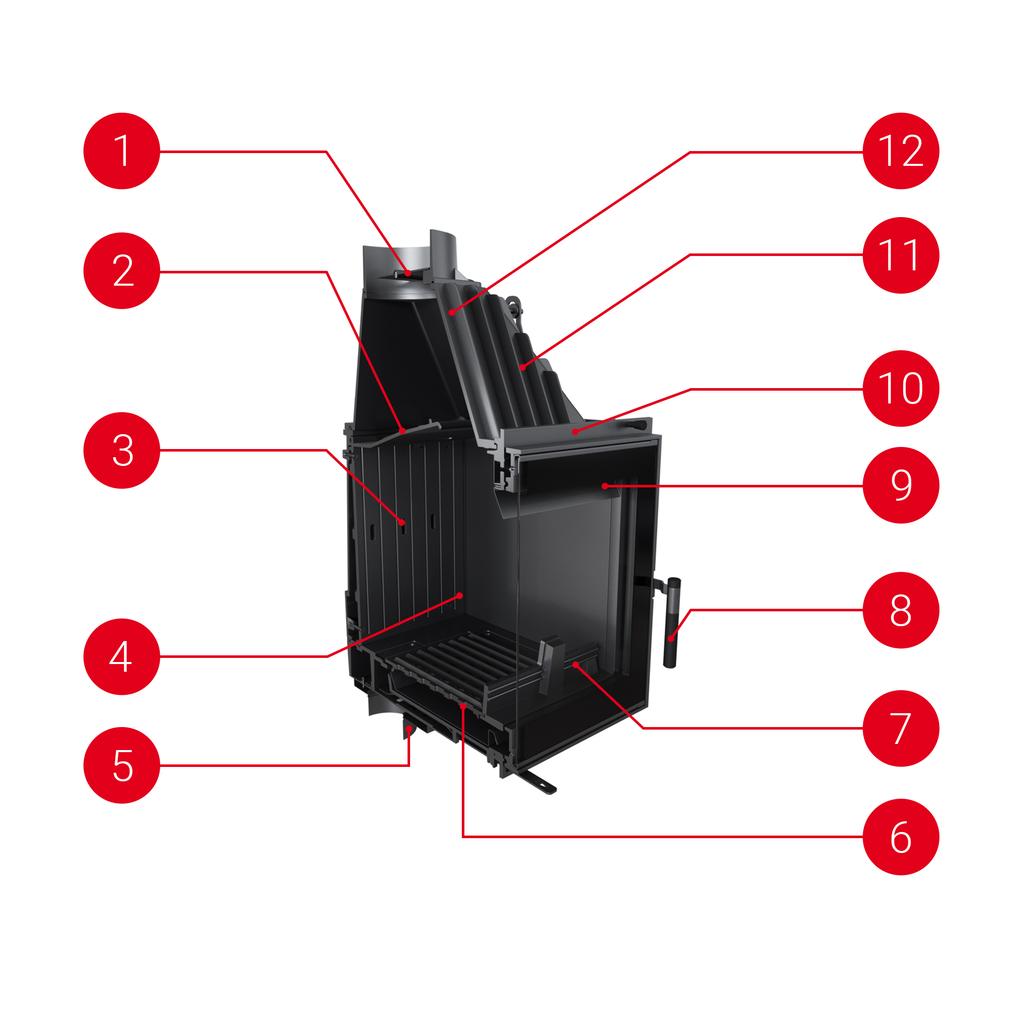 Вторичный воздух подается через отверстия в задней стенке печи, что создает систему дожигания.. Система отвечает за сжигание газов и снижение выбросов вредных веществ в окружающую среду.. Это повышает эффективность камина, что напрямую влияет на очень низкий уровень выбросов CO.