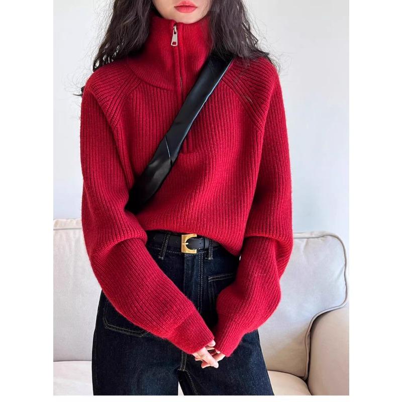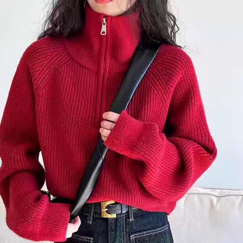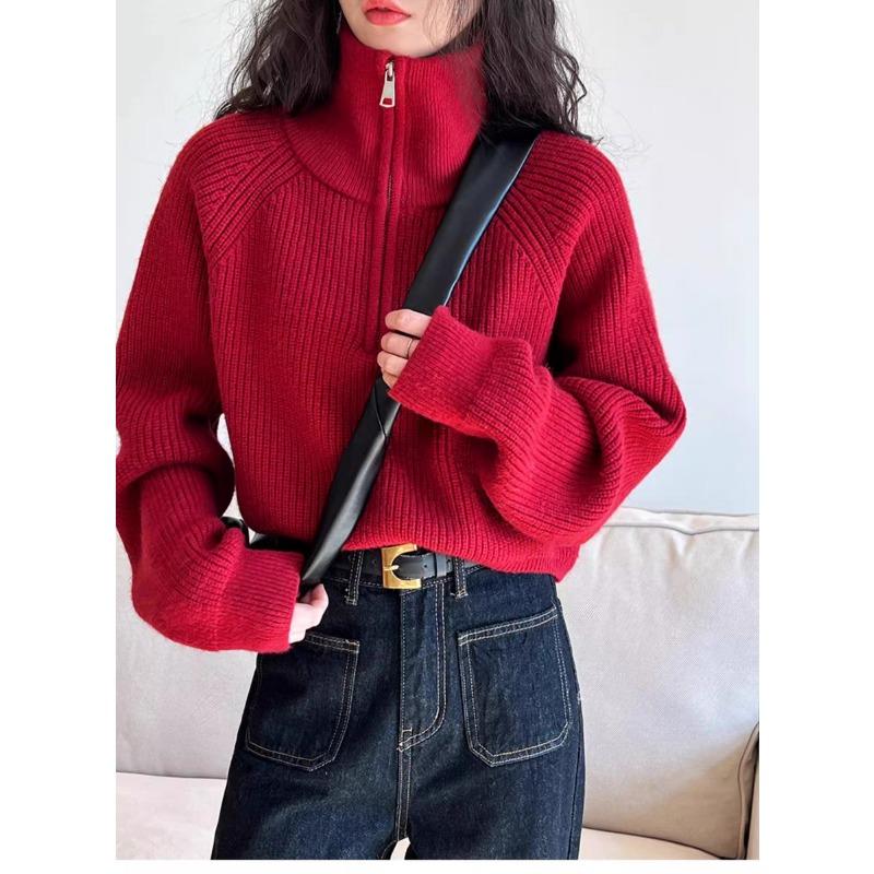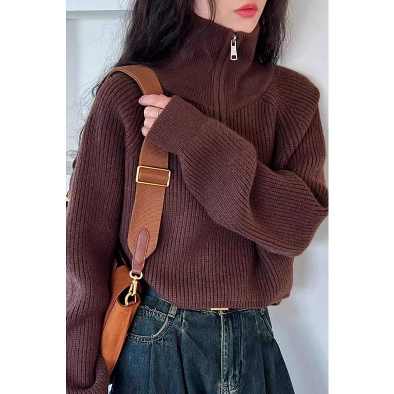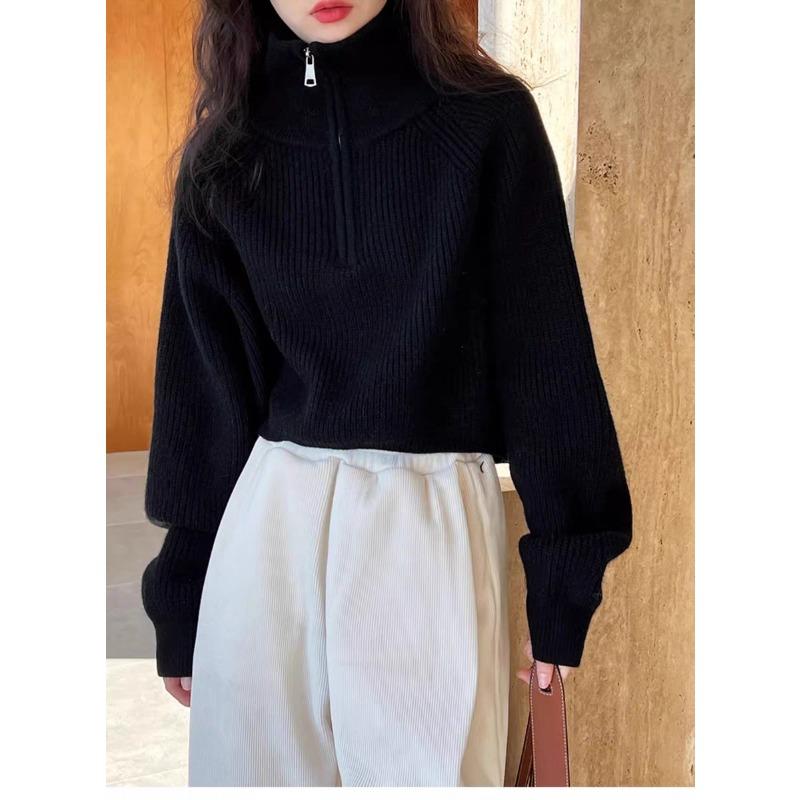 Модный осенне-зимний женский вязаный свитер с полувысоким воротником на молнии, с длинным рукавом, свободный, короткий топ, новая однотонная офисная повседневная простая одежда