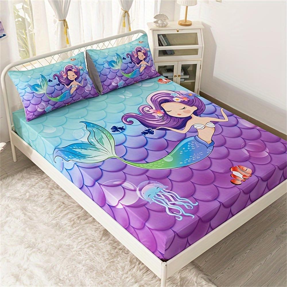 3 шт. Милая простыня на резинке с принтом русалки и океана, мягкий удобный постельный набор, для спальни, гостевой комнаты 1*простыня на резинке+2*наволочки