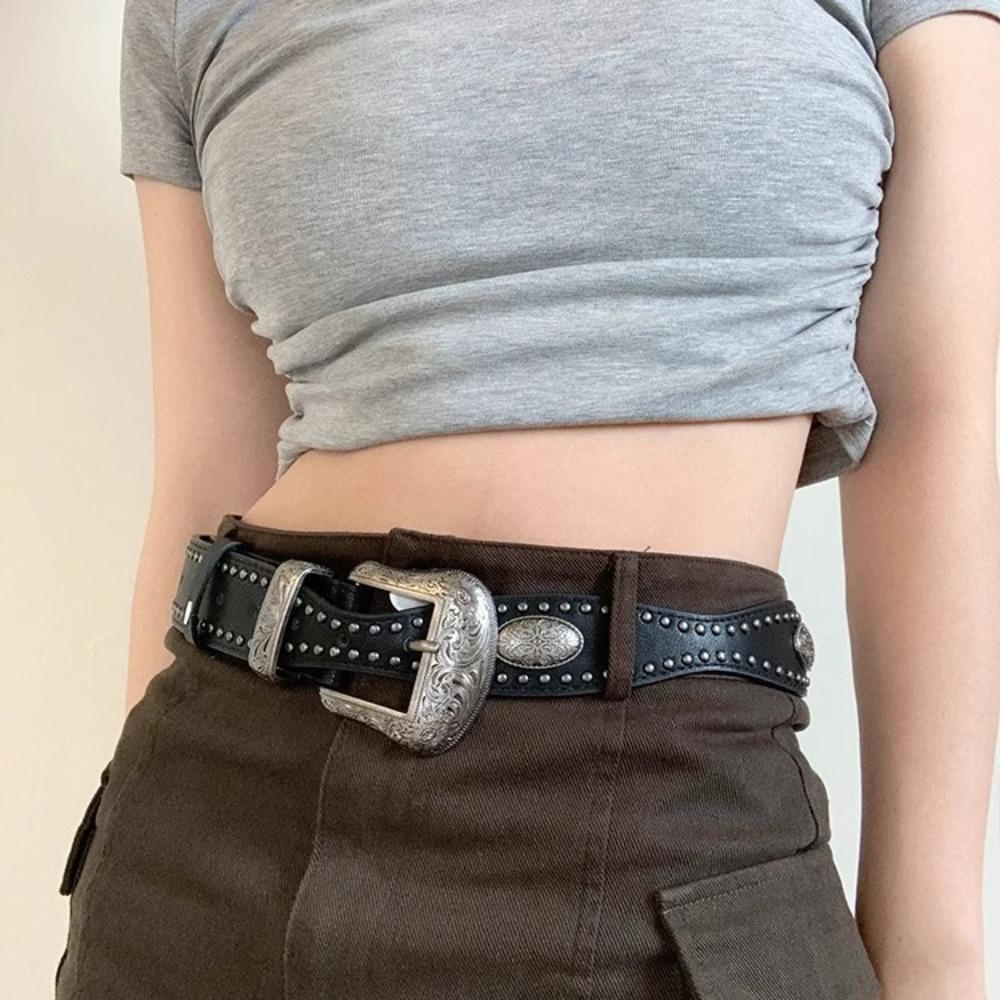 Крутой Черный Ремень с Заклепками Широкий Кофейный Y2K Пояс Декор для Джинсов ПУ Винтажный Пояс на Талию Подарок
