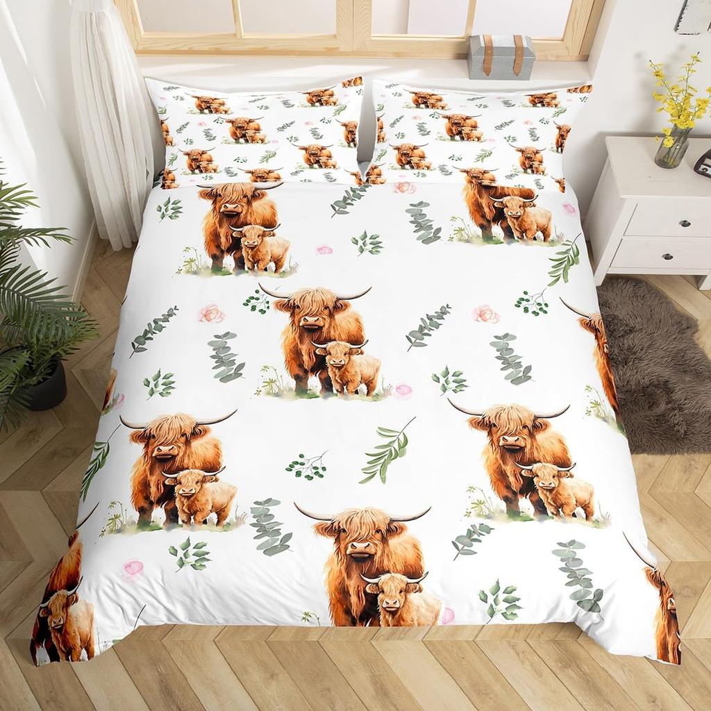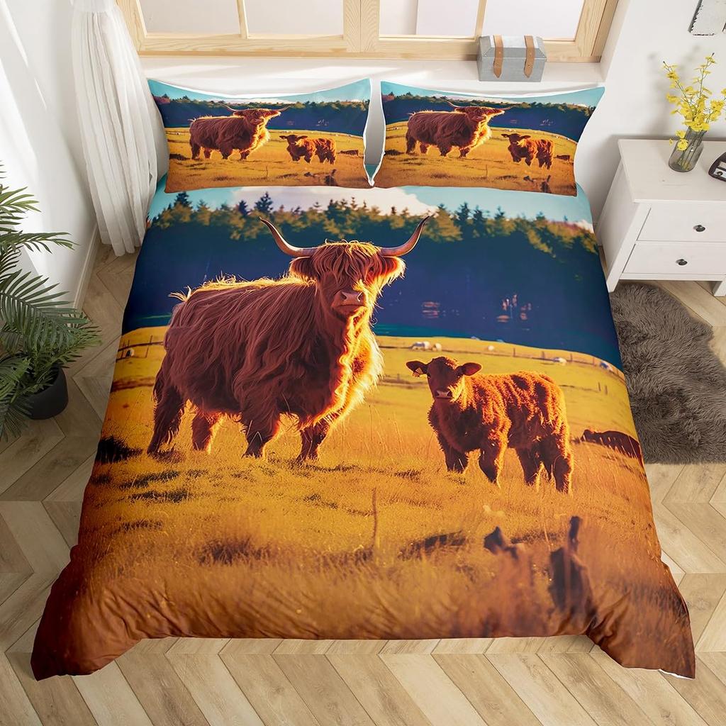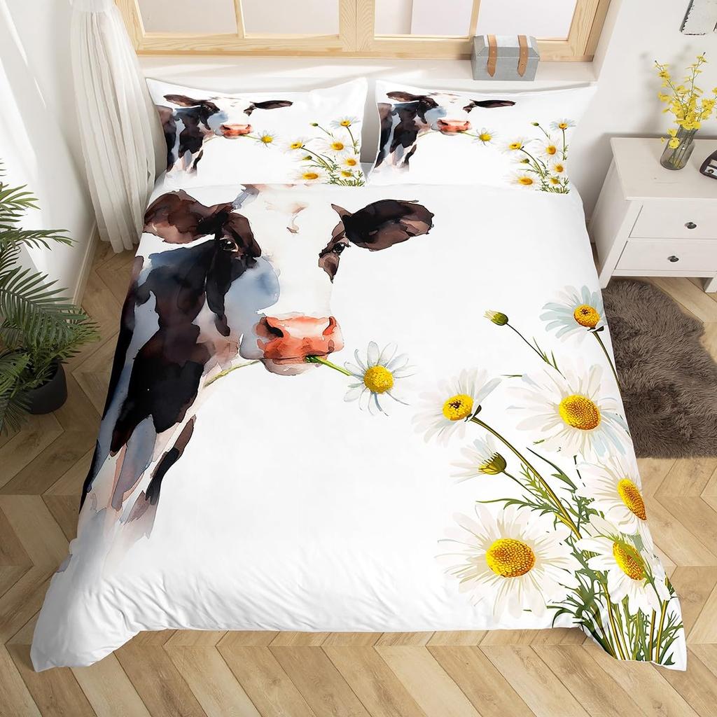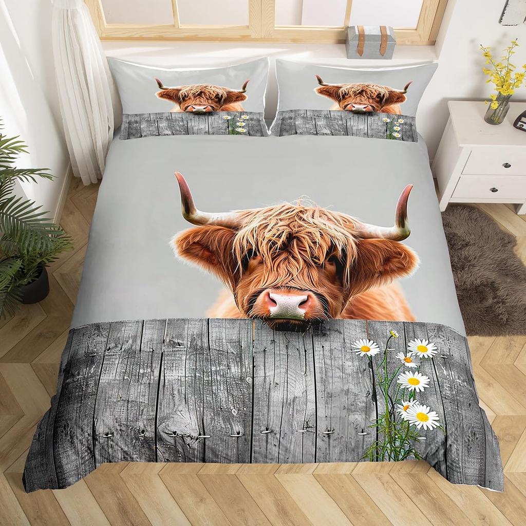 Пододеяльник с изображением коровы в горной местности, геометрический деревянный комплект постельного белья в деревенском стиле с цветами, покрывало для одеяла с изображением коровы