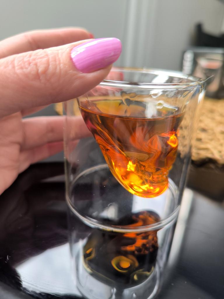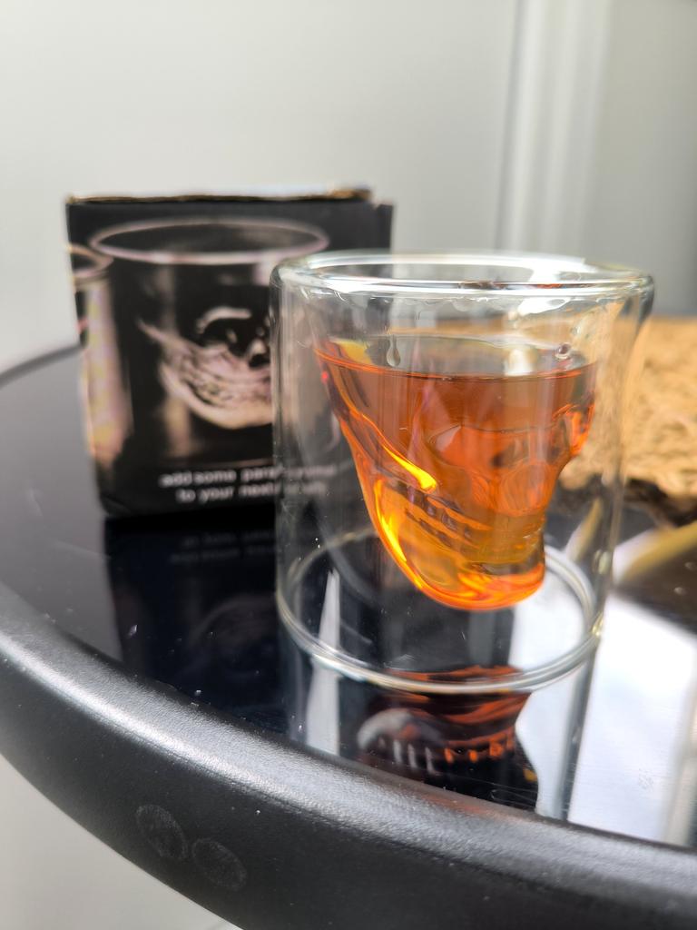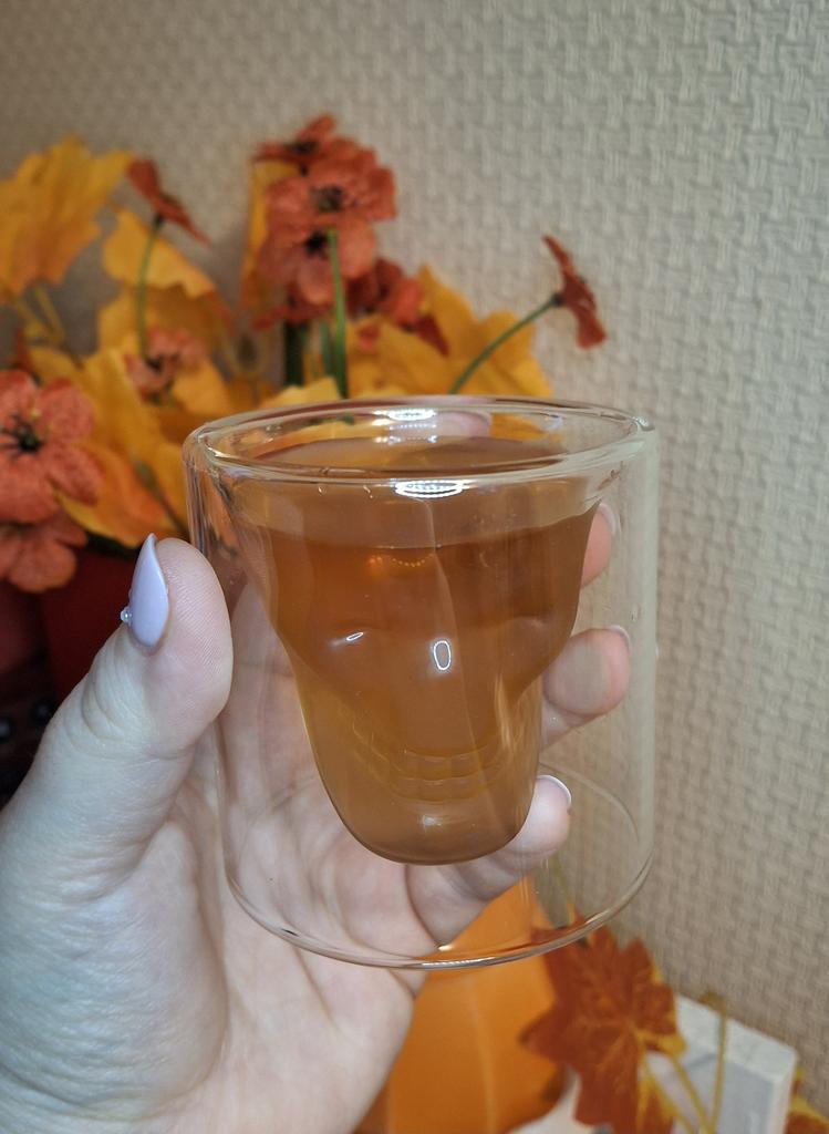 💀СТЕКЛЯННАЯ СТОПКА С ДВОЙНЫМИ СТЕНКАМИ В ВИДЕ ЧЕРЕПА ДЛЯ КРЕПКИХ НАПИТКОВ💀 Очень клёвая стопка! Она необычна тем, что имеет двойные стенки, выполненные в виде черепа. Такая стопка предназначена для крепких напитков, например виски, коньяк, бренди. Изображение черепа при использовании таких напитков достаточно заметно. Ведь напитки имеют тёмный цвет. Поэтому рекомендую наливать именно их. Стопка довольно большого размера. Выполнена очень качественно. Претензий нет. Стекло гладкое, кристально прозрачное. Размер стопки составляет 7*7 см. Объём точно сказать не могу. Но думаю, что грамм 50-75 в стопку помещается. Стопку я получила упакованной в пупырчатую плёнку и в коробку. Пришла в целостности и сохранности. Прорисовка черепа выполнена в точных деталях. Такая стопка будет отличным подарком для любителей крепких спиртных напитков. И непременно украсит Ваш бар. А также удивит гостей. Рекомендую приобрести эту стопку. Она классная!