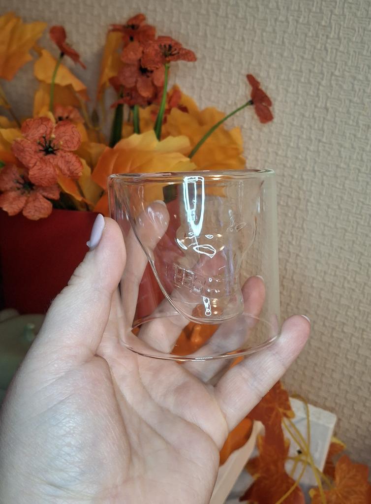 Когда хочется чего-то ну очень необычного 😁 Доставка составила около двух недель. При транспортировке ничего не повредилось и стакан пришёл без брака. Материал - стекло. Не особо плотное. Стакан не большой, но оригинальный. Объем черепа - 50 мл. Можно наливать и с обратной стороны. Там около 100 мл. С жидкостью череп становится более чётким и проявленным. Смотрится классно. Покупкой осталась довольна. Такой стакан будет интересным подарком. Особенно для ценителей такой тематики. Мой ребёнок в восторге. К приобретению рекомендую.