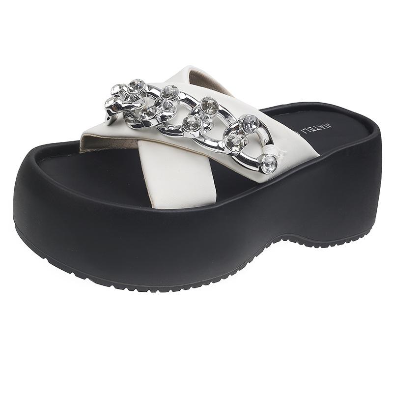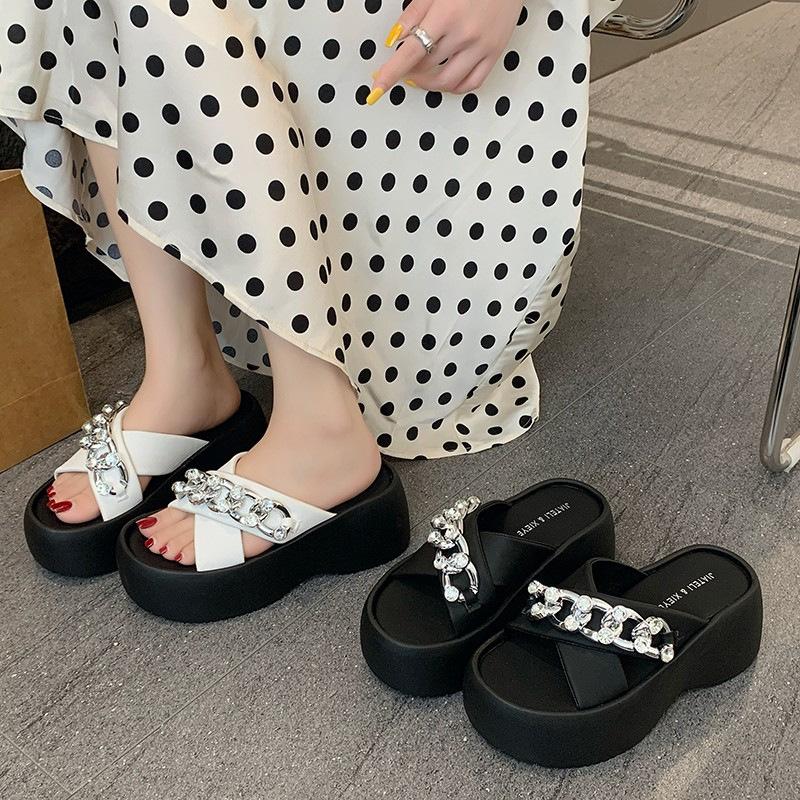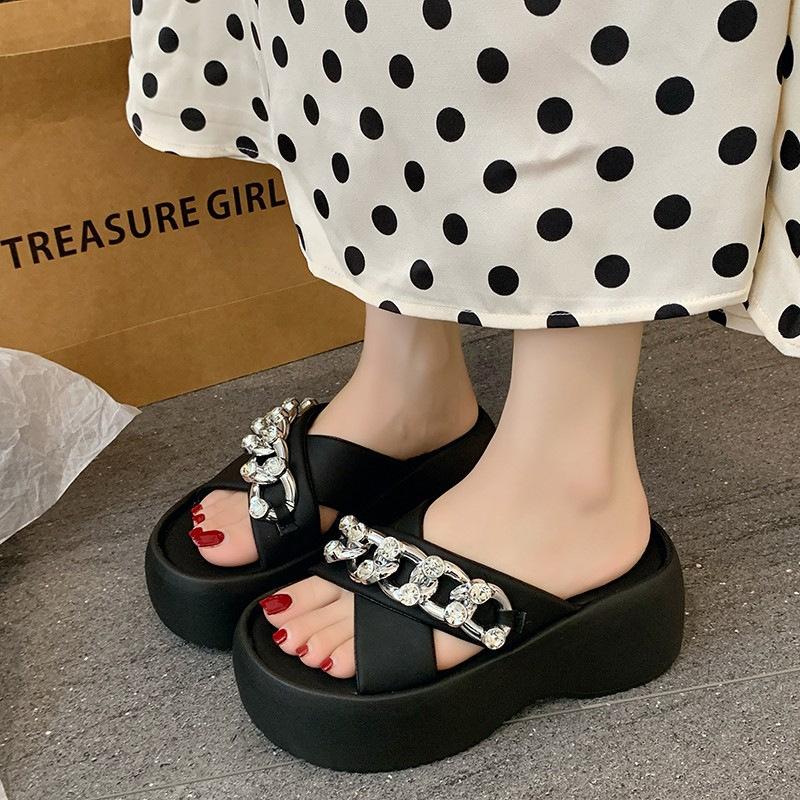 Популярные крутые шлепанцы на толстой подошве для женской уличной обуви 2025 лето новые высокоценные шлепанцы с металлической цепочкой и мягкой подошвой с перекрестными ремешками для женщин