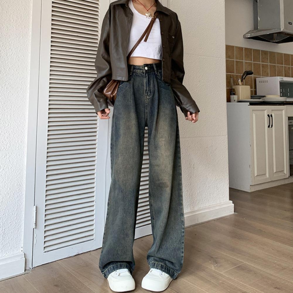 American retro wide-leg jeans women's autumn and winter new small cement gray loose straight jeans