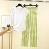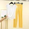 Женский повседневный и удобный топ с круглым вырезом однотонной расцветки и брюки с клетчатым принтом большого размера