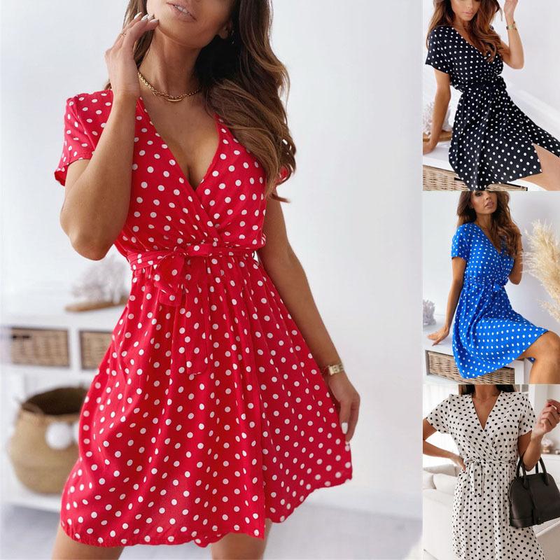 Женское летнее модное мини-платье с коротким рукавом и V-образным вырезом, женское платье в горошек с разрезом, Vestidos для женщин, пляжное платье в стиле бохо — купить товар онлайн с бесплатной доставкой по всему миру!