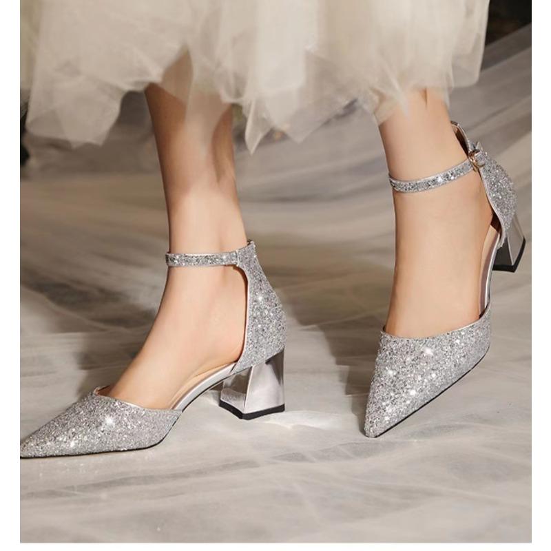 Роскошные серебряные золотые босоножки женские летние остроносые элегантные туфли на высоком каблуке с кристаллами женские шлепанцы с блестками для вечеринки, банкета, свадьбы