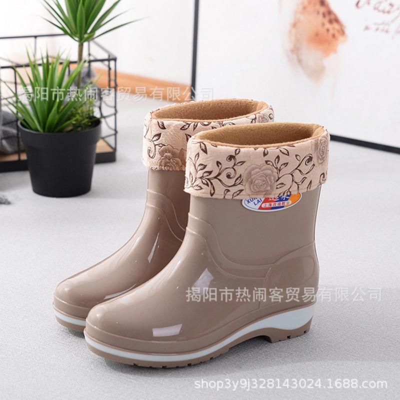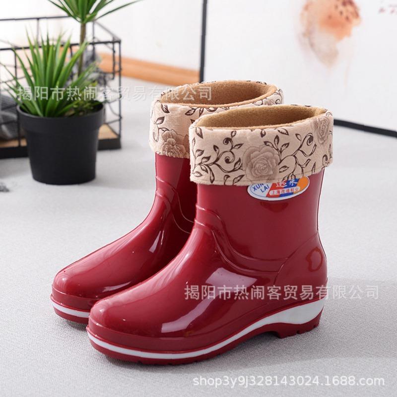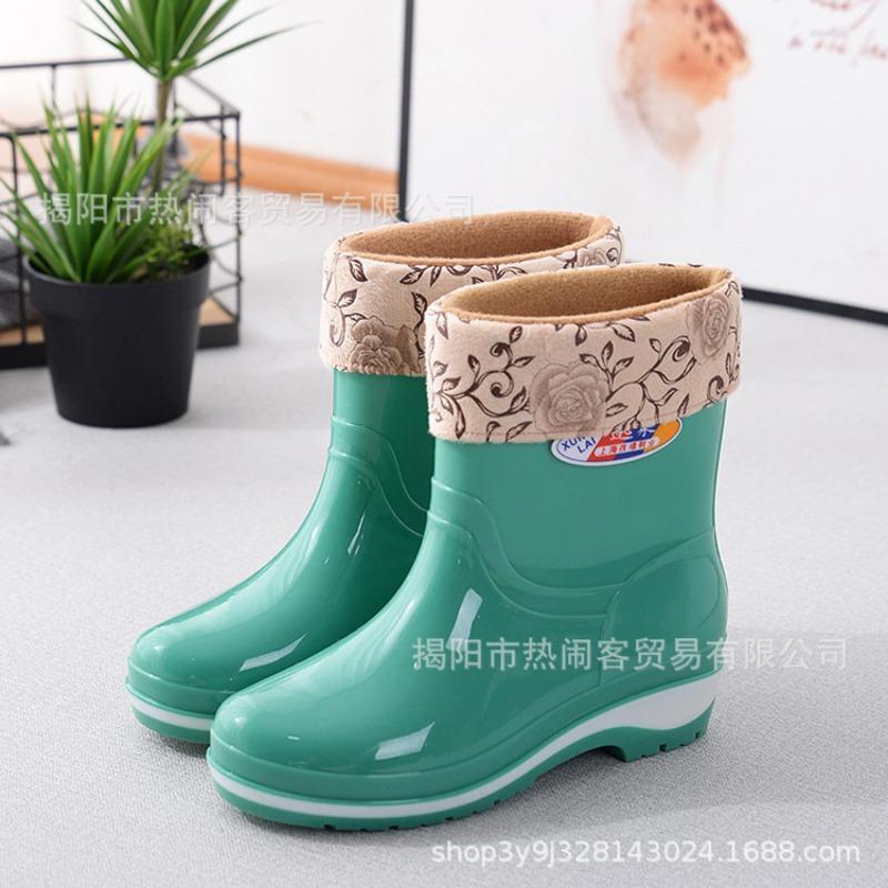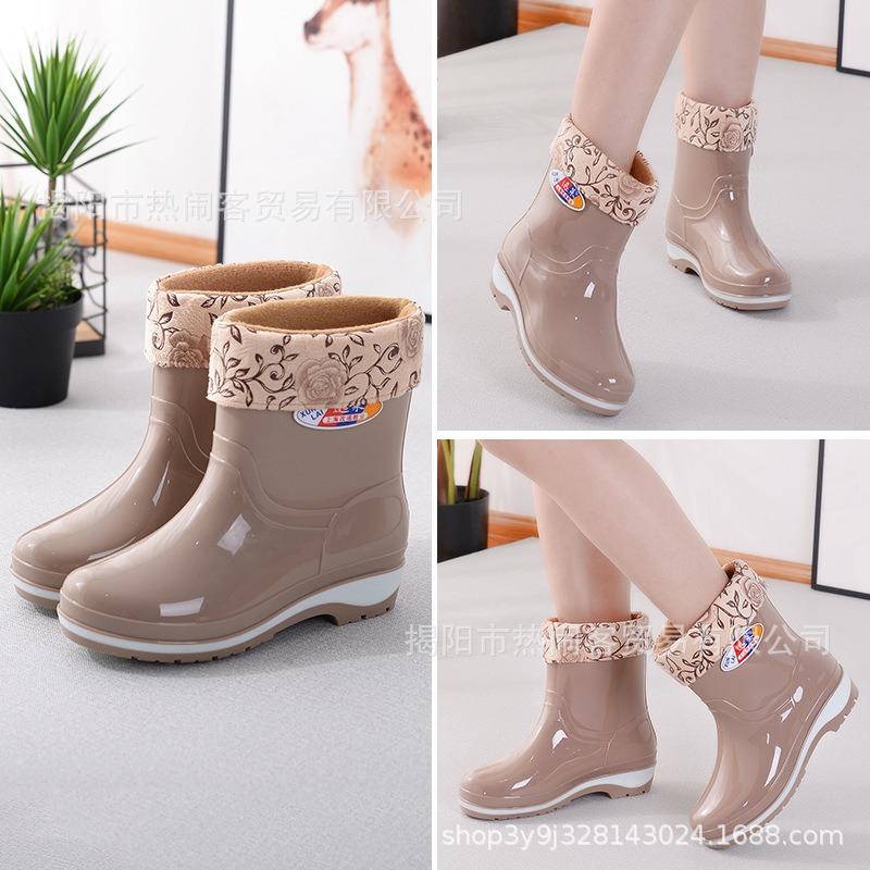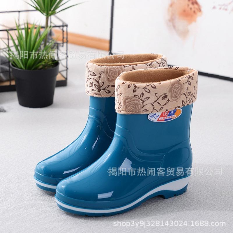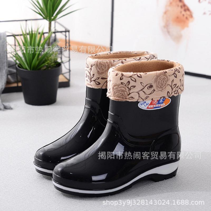 Модные женские резиновые сапоги средней длины, водонепроницаемые сапоги для столовой, нескользящие черные женские резиновые сапоги, взрослые хлопковые термосапоги