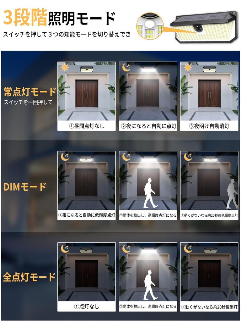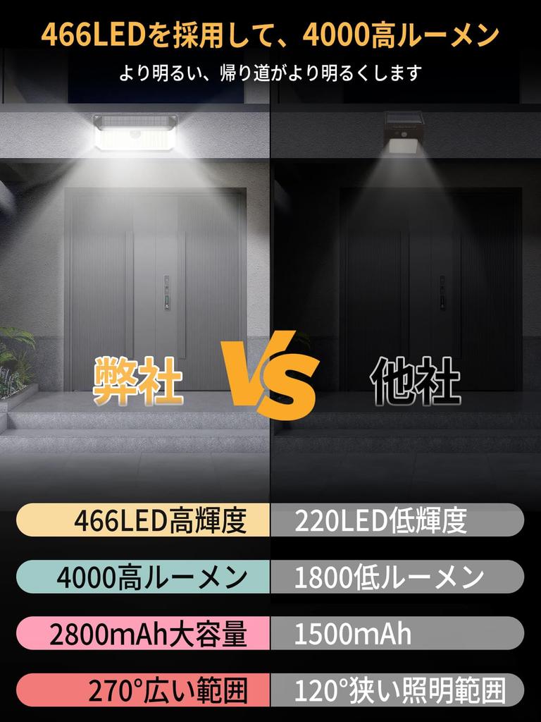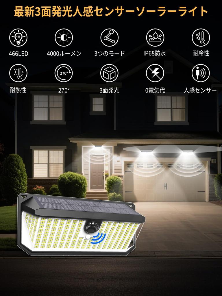 [Новое поколение светодиодов 466 4000 лм высокой яркости, 3-сторонняя подсветка, освещение 270°] Этот солнечный фонарь яркий даже днем! Сенсорный светильник автоматически заряжается и включается при наступлении темноты. 466 светодиодов высокой яркости излучают 4000 лм дневного света, что почти вдвое ярче, чем у обычных продуктов, тщательно освещая весь ваш двор.. Трехсторонняя конструкция подсветки создает широкий угол освещения 270°, полностью устраняя слепые зоны.. Значительно улучшенная безопасность!