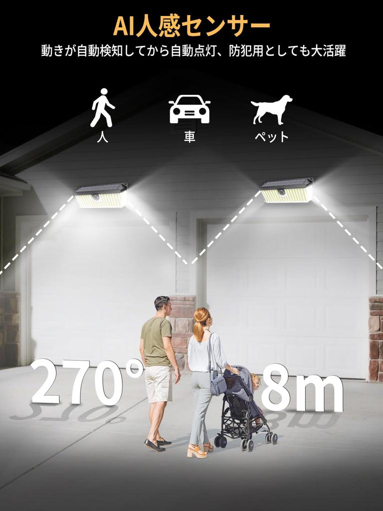 Солнечный свет нового поколения, который обеспечивает безопасность вашей семьи 365 дней в году: Лучшее решение для наружной безопасности! Этот солнечный светильник оснащен высокочувствительным датчиком с искусственным интеллектом, который обнаруживает людей, транспортные средства и животных на расстоянии до 8 метров и освещает их за 0,3 секунды.. 466 светодиодов высокой яркости излучают 4000 лм света с трех сторон, обеспечивая широкий угол освещения 270°, как при дневном свете, полностью устраняя слепые зоны.. Трехпозиционное крепление (винты, ремни и двусторонний скотч) исключает сложную проводку и может быть установлен всего за 5 минут, даже профессионалом.** Он идеально подходит для любого открытого пространства, включая подъезды, сады и заборы. ▼ Долговечность, не зависящая от погоды ・IP68 полностью водонепроницаемый и пыленепроницаемый: Погружаемый на глубину до 1 м на 72 часа, поэтому он остается включенным даже во время тайфунных ливней ・Совместим с -30°C до 60°C: Стабильная работа от экстремального холода Хоккайдо до палящей жары Кюсю ・ Большая емкость 2800 мАч: До 15 часов непрерывного освещения, даже зимой (рекордно высокая эффективность преобразования 27%) ▼ Умное управление освещением Свободное управление светом с 3 режимами переключения: Режим постоянного включенного: Постоянное освещение средней яркости в темноте в режиме DIM: Режим ожидания при слабом освещении → 100% освещение при обнаружении присутствия человека (длится 25 секунд) Режим сильного датчика освещенности: Полное освещение только при обнаружении присутствия человека/транспортного средства, что максимизирует экономию энергии ▼ Обещана 10-летняя уверенность ・Эко-дизайн, который снижает счета за электроэнергию на 2300 иен в год и выбросы CO₂ на 87% ・12-месячная гарантия производителя + 1