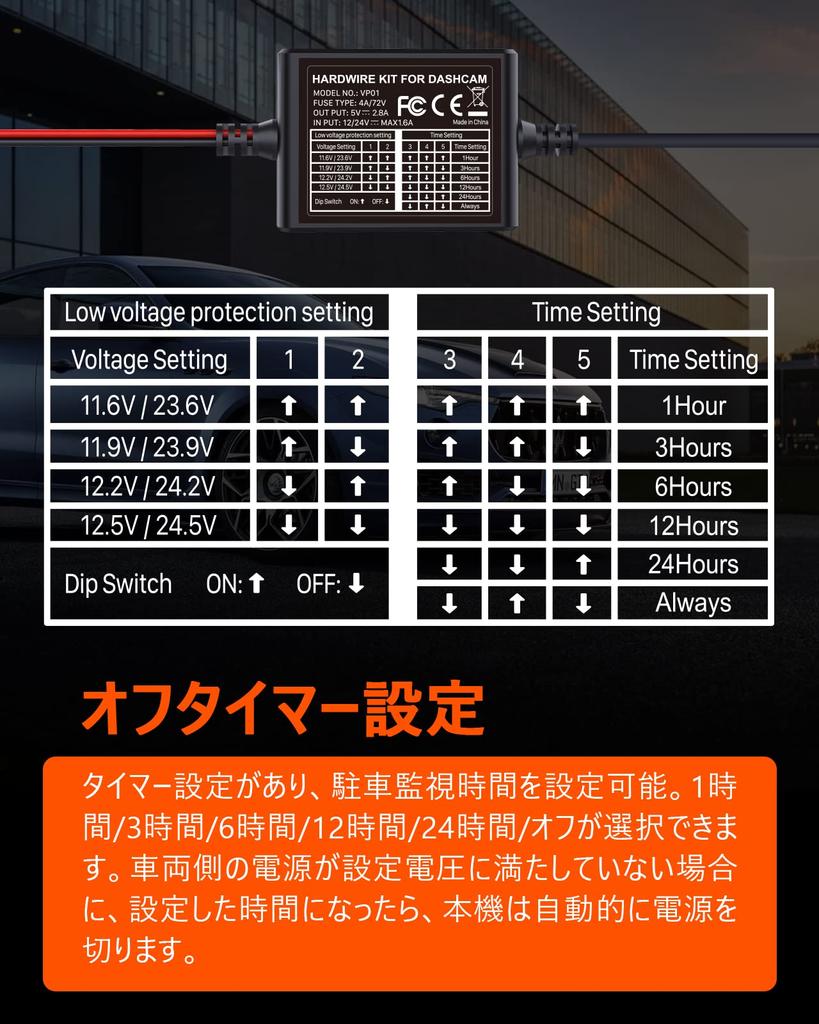 Настройки таймера: Вы выбираете между 1 часом, 3 часами, 6 часами, 12 часами, 24 часами и выключено. Из-за настройки таймера устройство автоматически выключится, если напряжение питания со стороны автомобиля не соответствует установленному.. Или выключить по достижении таймера. Настройка первой досягаемости приоритезирует ранее достигнутое. Если вы выберете «выкл.», видеорегистратор останется в режиме мониторинга парковки, пока напряжение бортовой сети автомобиля не опустится ниже установленного низкого значения.. Теперь вы защищаете свой автомобиль 24 часа в сутки!