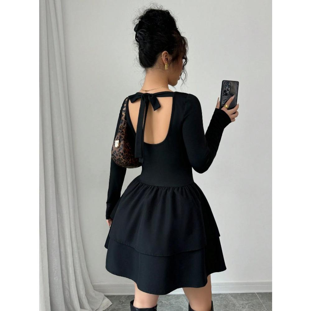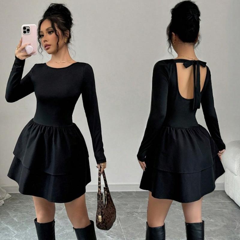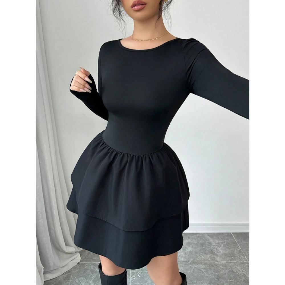 Весна осень повседневный облегающий черный эластичность оборка пышное платье элегантное А-силуэта с круглым вырезом длинным рукавом однотонное вечернее мини-платье женское