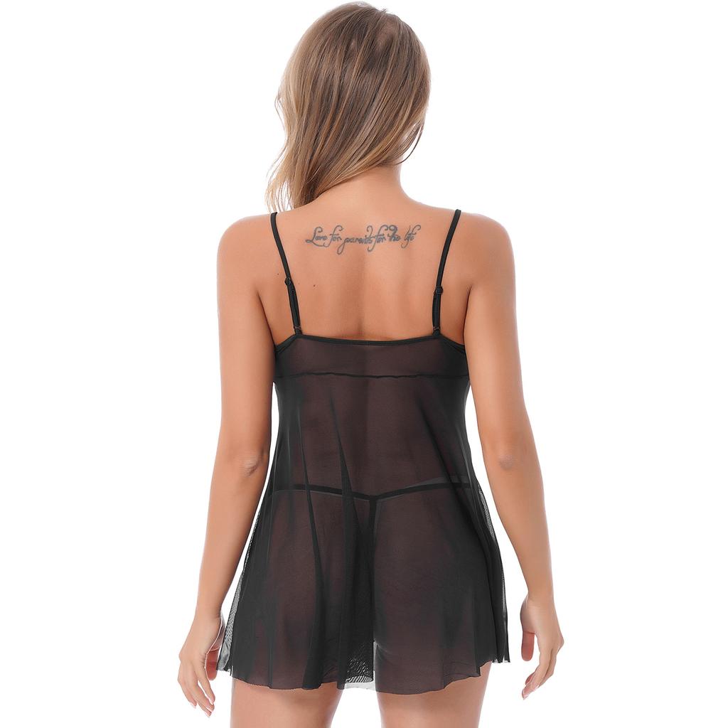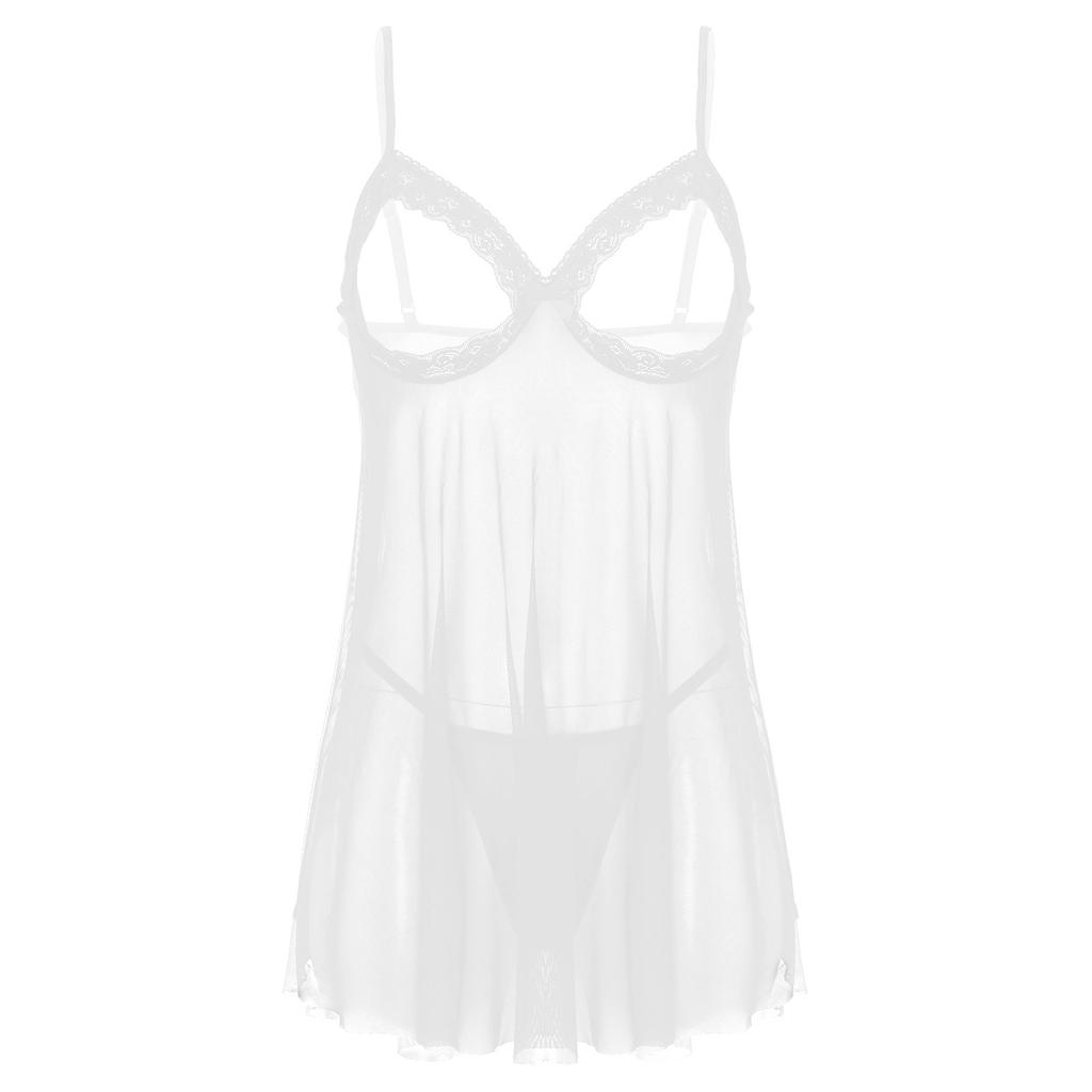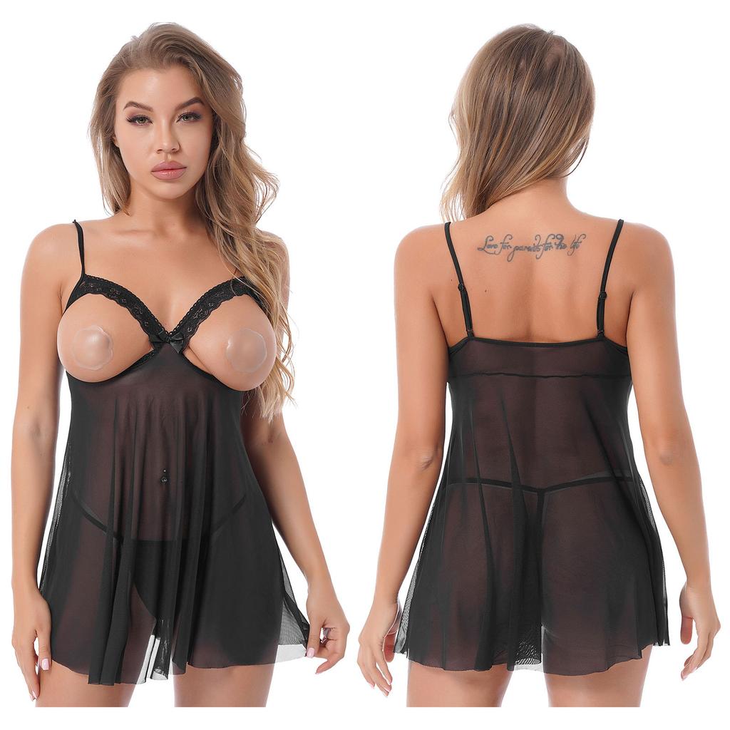 Женский прозрачный кружевной комплект бэбидолл - Сетчатая ночная одежда с открытыми чашками и регулируемыми бретелями-спагетти (Плюс Размер)
