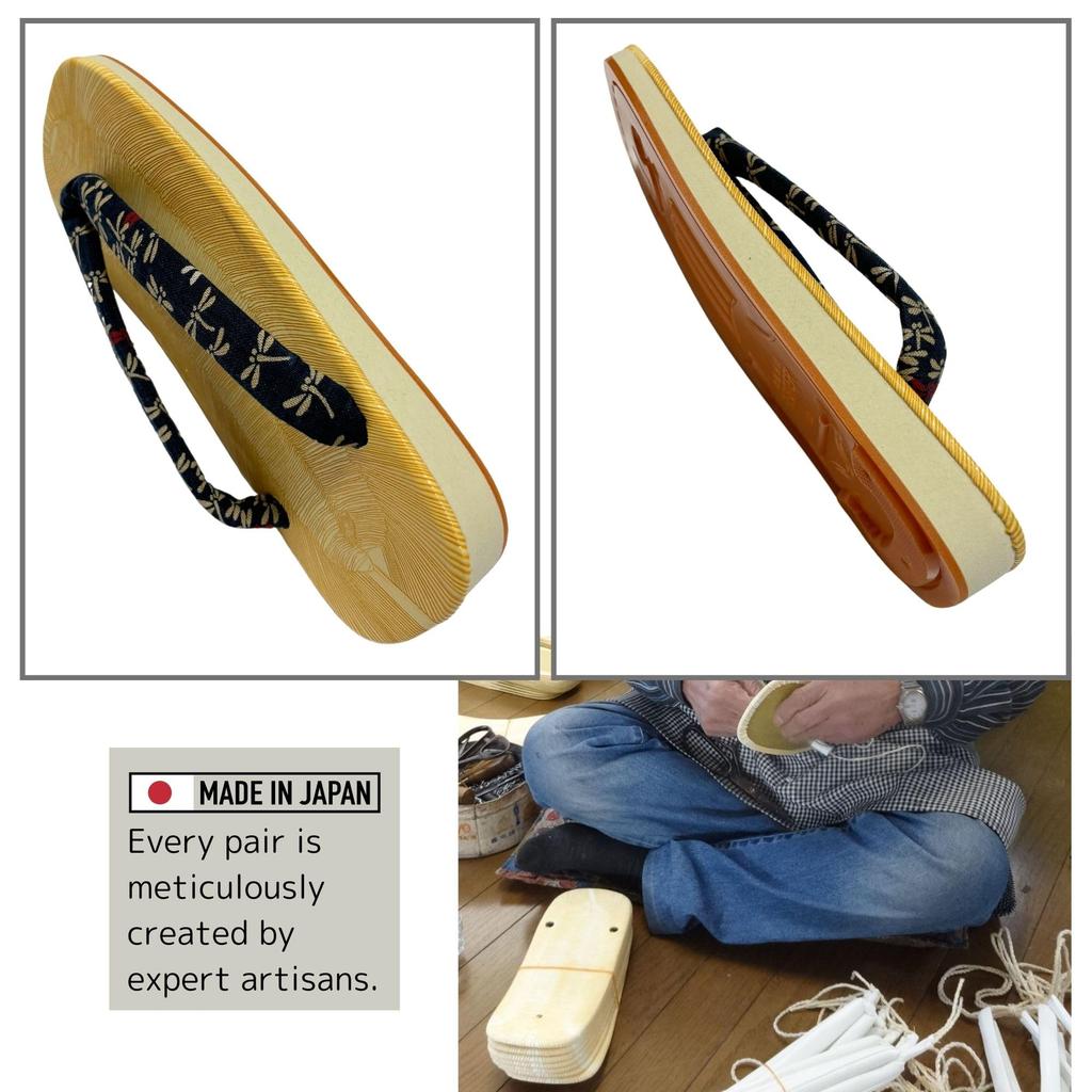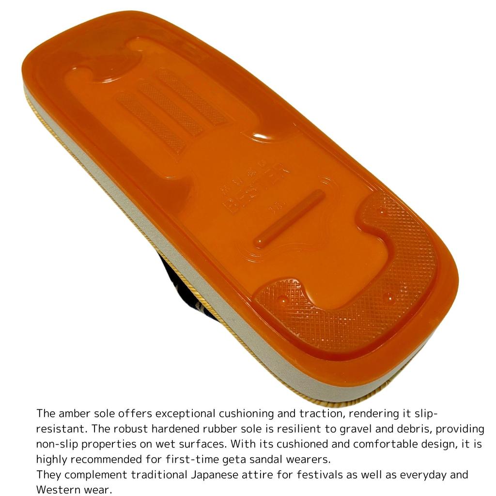 Сандалии гета на подошве амэ-соле с отличной амортизацией и сцеплением, делающие их нескользящими. Прочная подошва из закаленной резины предотвращает погружение гравия в необорудованные поверхности.. Они также обладают отличной устойчивостью к скольжению на мокром полу.