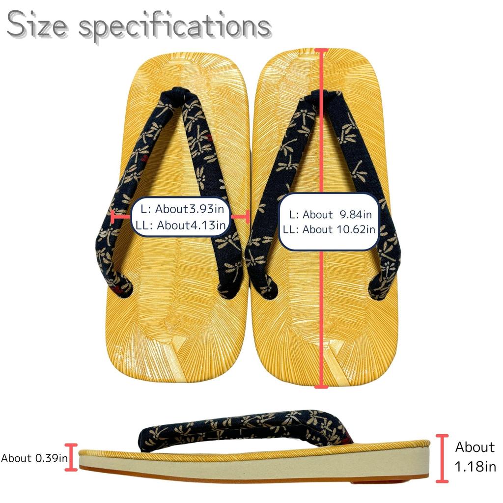 Тем, кто носит сандалии размера 26,5 см впервые, мы рекомендуем размер LL, так как перемычки могут показаться слишком тугими.. Мы также рекомендуем размер LL для тех, у кого высокий подъем стопы.. Привыкнув к ношению гэта, более длинная пятка больших размеров может затруднить ходьбу.. Сандалии гэта не бывают правыми или левыми, и нормально, что пятка и мизинец выступают.. Их традиционно носят немного меньше по размеру. Подошва: Аме-соле, желтый татами мат, внешний слой: винил. Сделано в японии. Они отлично смотрятся с джинсами или в повседневной носке! Подошва «амэ» нескользящая и удобная в носке, что делает их отличным выбором для тех, кто впервые носит сандалии гэта.