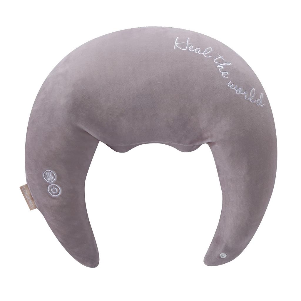 Форма, структура и принцип: Массажер для шеи с массажными шариками и нагревателем, прикрепленный к подушке в форме полумесяца.